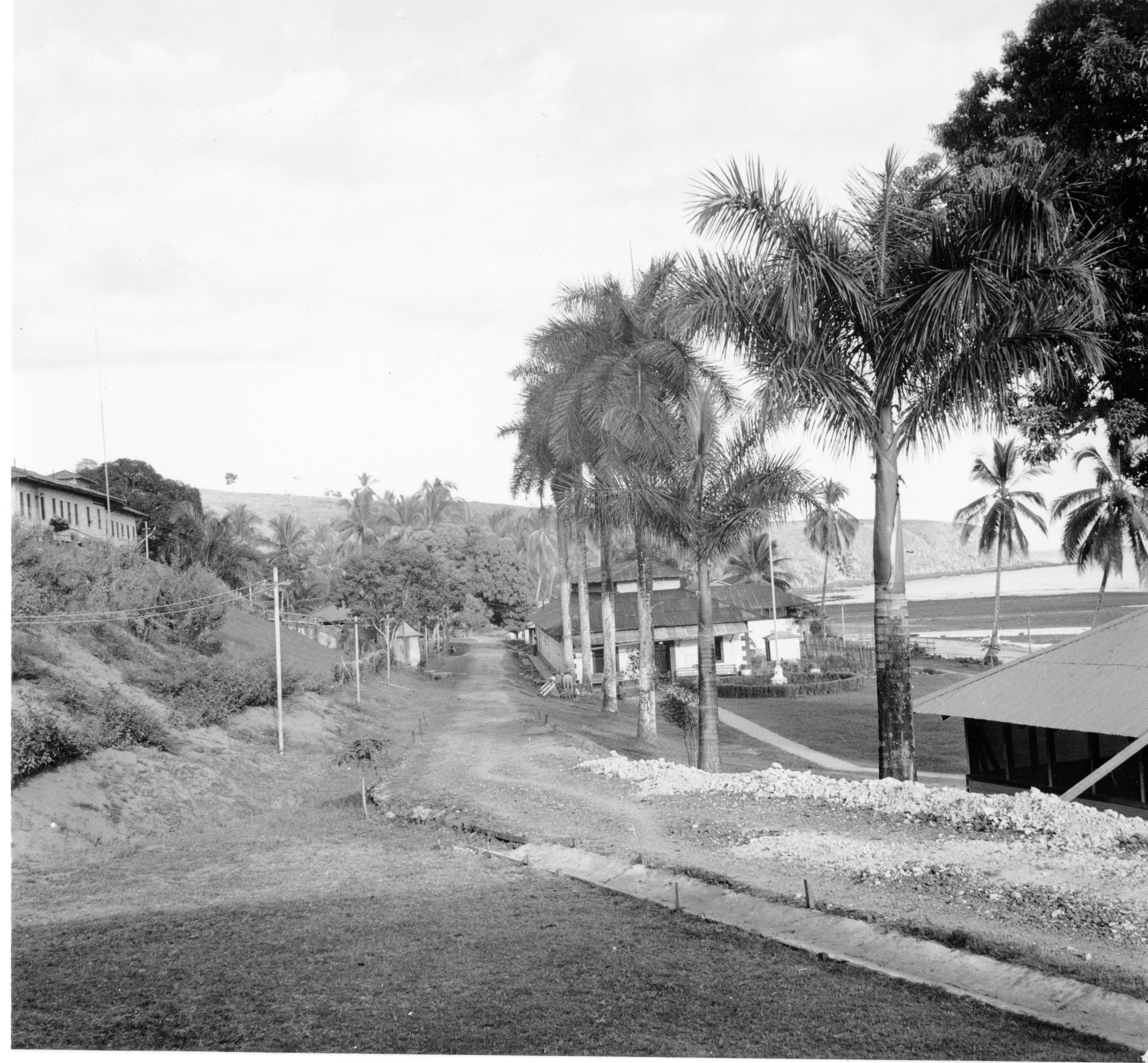 View of Main Street in La Central Colonia Penal, Coiba Island, Panama. Coiba Island is off the southwest coast of Panama that served as a penal colony at the time. The image was taken by Smithsonian Secretary Alexander Wetmore while on a scientific expedition in Panama to Coiba Island, while completing field work for his four volume work, The Birds of Panama.