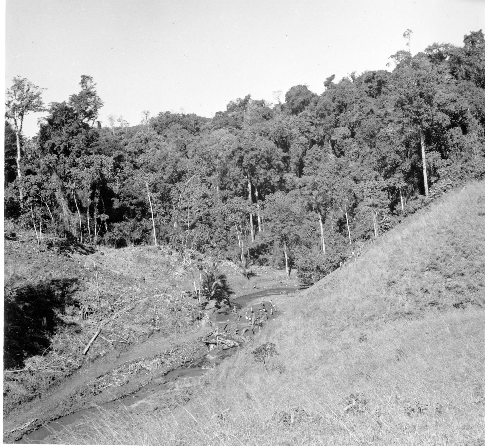 People, probably prisoners from the penal colony, are cleaning the dam that supplies water to Coiba Island, Panama. The image was taken by Smithsonian Secretary Alexander Wetmore while on a scientific expedition in Panama to Coiba Island, while completing field work for his four volume work, The Birds of Panama.