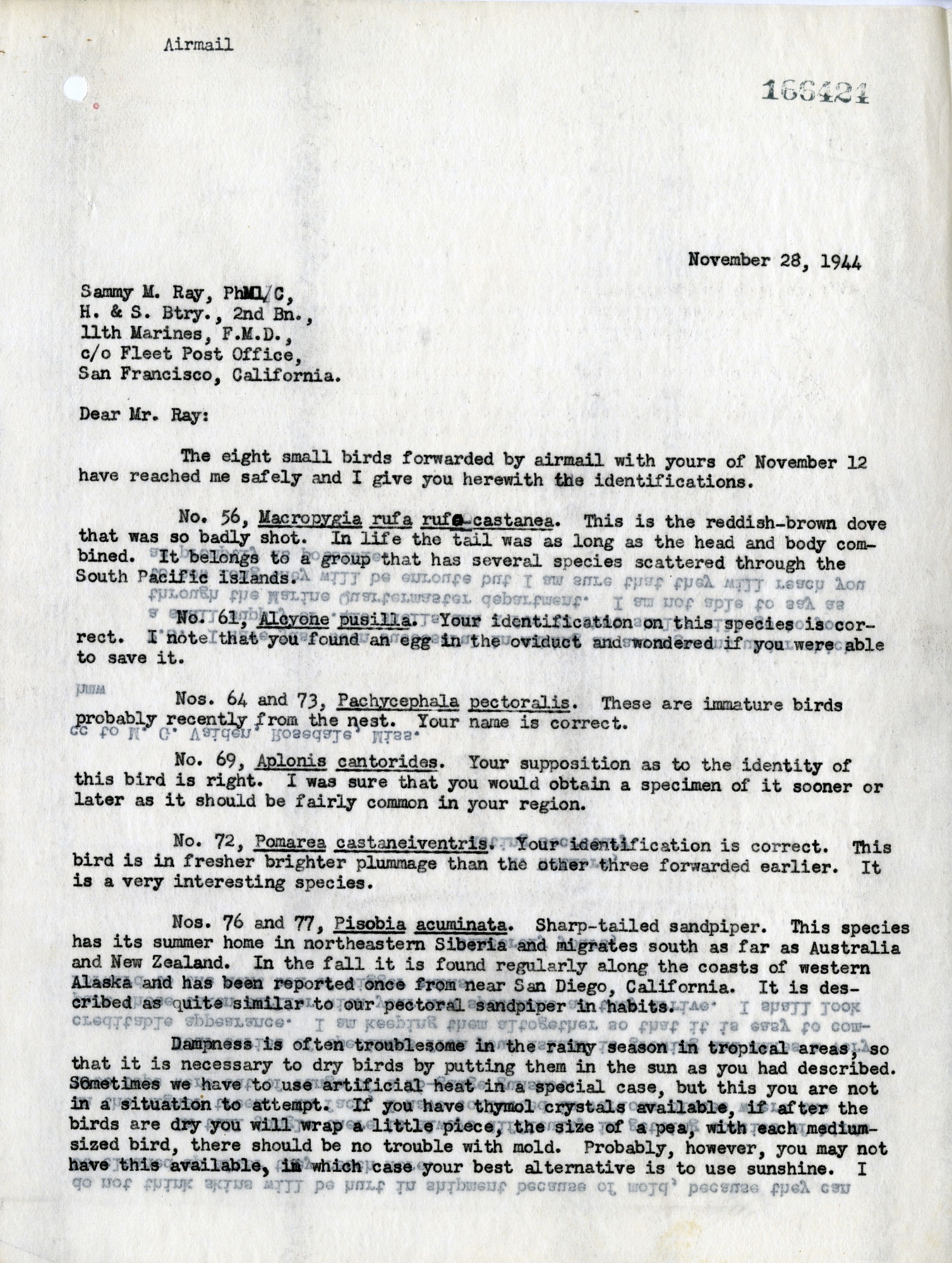 A two sided letter written by Alexander Wetmore, then Acting Secretary of the Smithsonian, to Sammy M. Ray, a Pharmacist's Mate I/C in the U.S. Navy, from 1942-1945, on November 28, 1944. Ray and Wetmore maintained an active correspondence throughout Ray's tour of duty. The letter is a response to Ray's recent collecting activities, primarily birds, in the Pacific Islands during World War II. In the letter Wetmore helps Ray identify the specimens and offers advice on how to preserve and package the collections that Ray is sending to the United States National Museum. Ray was one of the many of the soldiers who collected specimens for the USNM during the war. Ray's specimens are housed in the National Museum of Natural History.