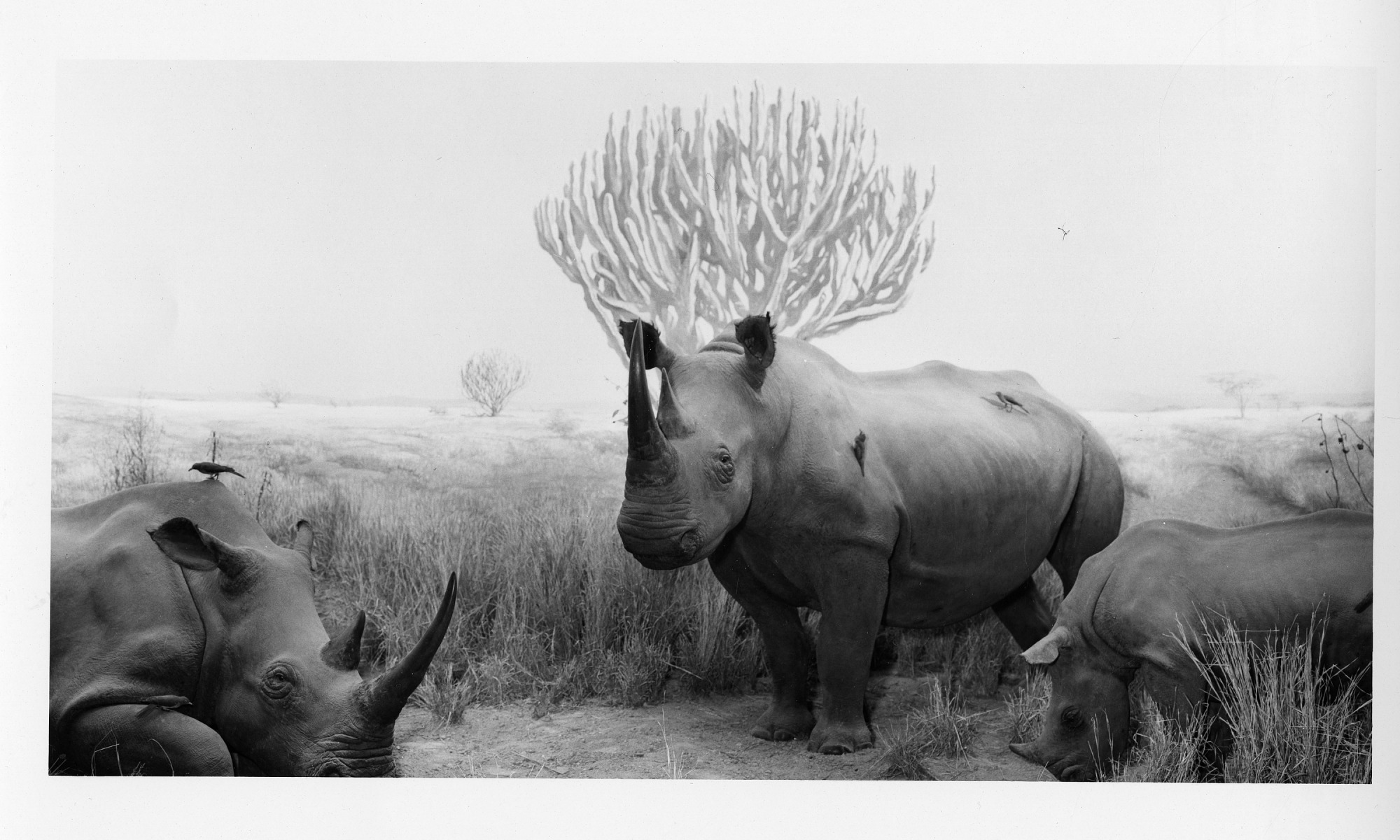 Three square-lipped rhinoceroses are displayed in a diorama in mammal hall of the National Museum of Natural History. These specimens come from the Smithsonian-Roosevelt Expedition of 1909-1910.