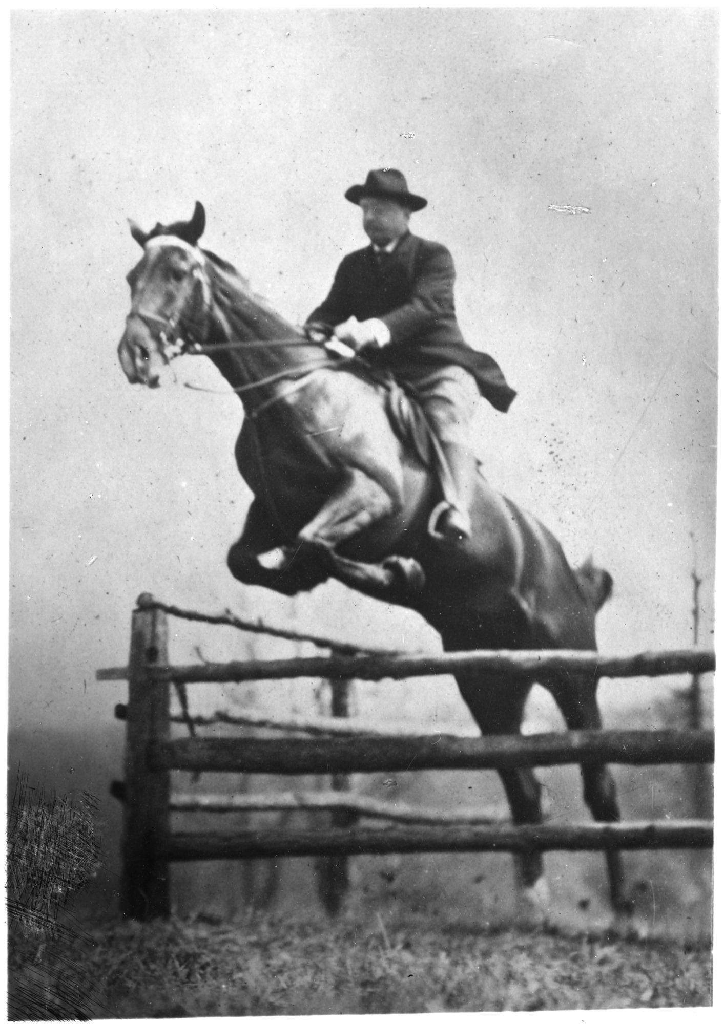 Theodore Roosevelt rides his horse as it jumps over a fence. Roosevelt was the youngest president ever elected at that time.