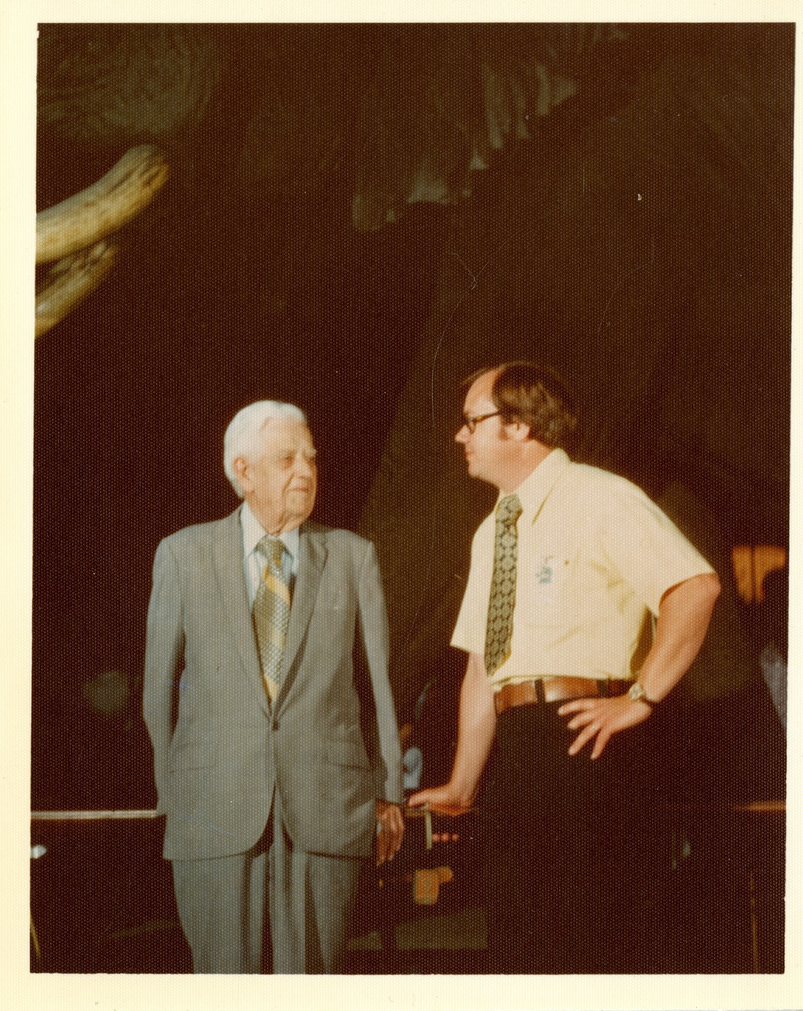 Frank Greenwell, taxidermist the National Museum of Natural History (NMNH), stands together with his mentor , William L. Brown, NMNH taxidermist, in front of the Fénykövi elephant, tusks of which are visible, in the rotunda of the museum. Greenwell came to the museum in 1957 when William L. Brown was leading the project to mount the Fénykövi elephant, then the largest land mammal exhibited in a museum.