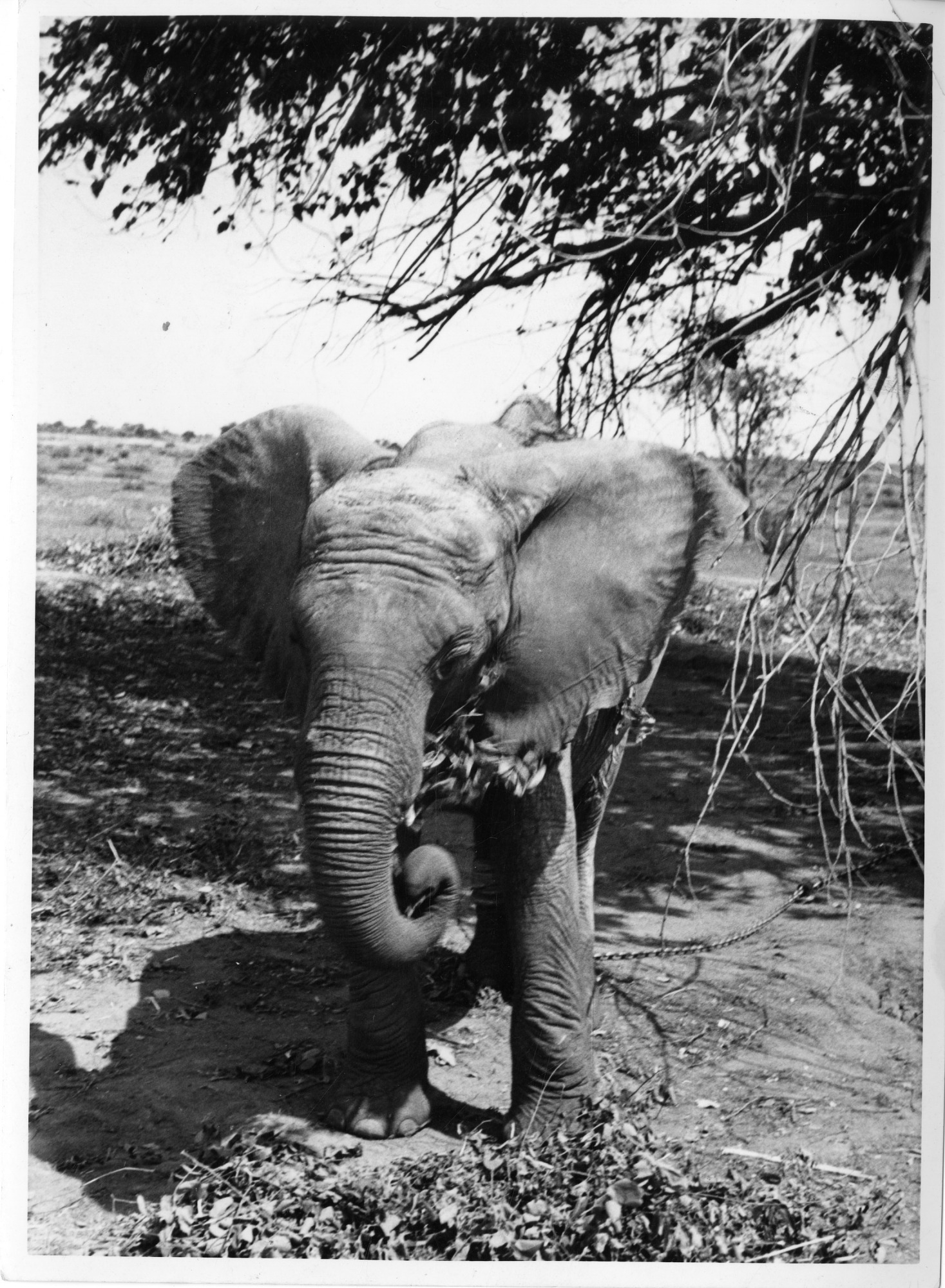 A front view of a recently captured young bull elephant eating. Josef J. Fénykövi sent a series of images in February 1958 of a young (15-18 years old) bull elephant, captured in Angola a few days before the photographs were taken, to Dr. Remington Kellogg, director of the United States National Museum (USNM), to help the USNM taxidermists in their preparation of a model, on which to mount the skin of a bull elephant donated by Fénykövi to the Smithsonian Institution, to be displayed in the Rotunda of the Natural History Building.