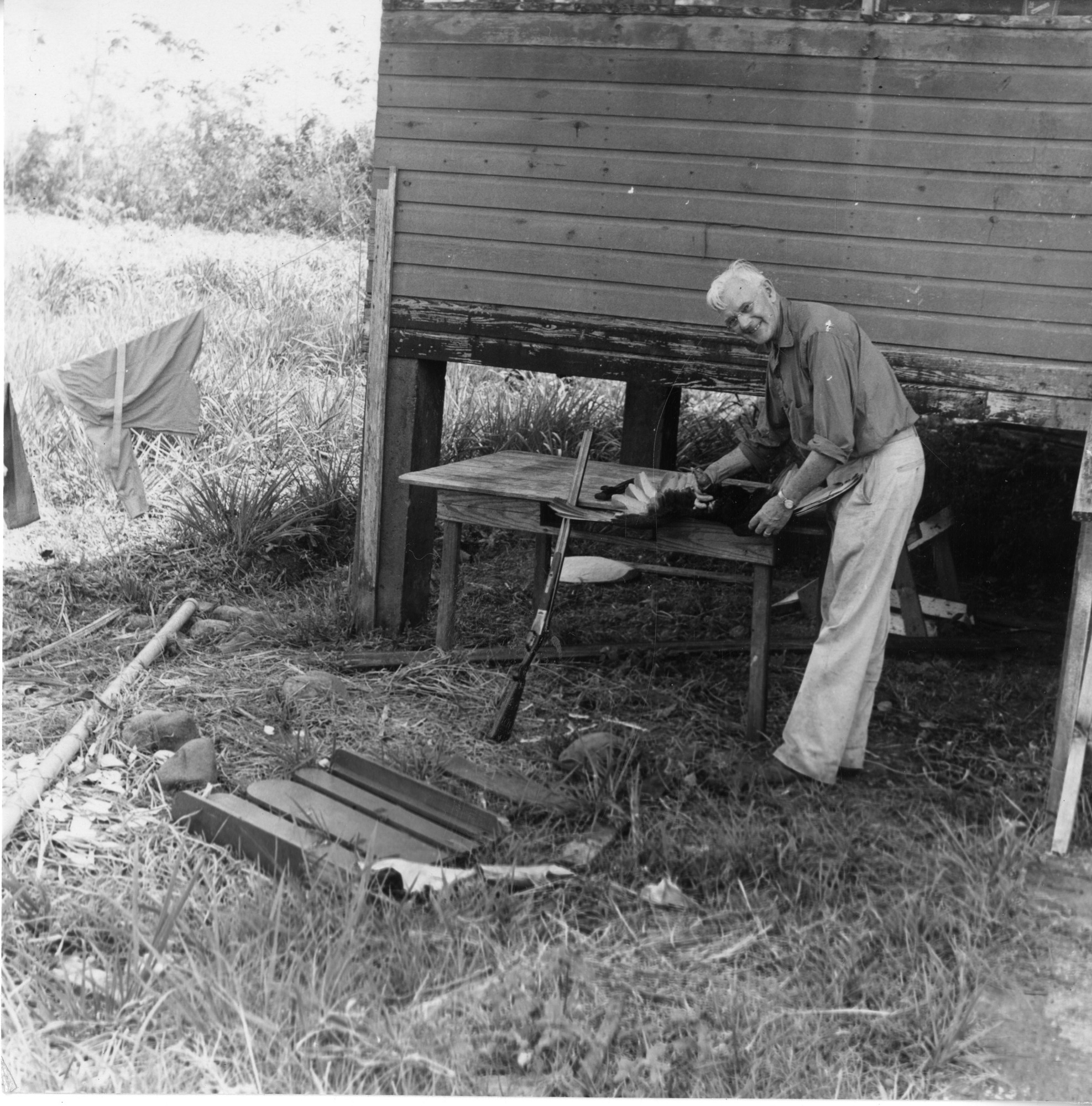 At Mandinga, San Blas, Panama, Alexander Wetmore, sixth Smithsonian Secretary and ornithologist, is preparing to skin a turkey buzzard. A gun leans against the table and clothes can be seen hanging on a line.