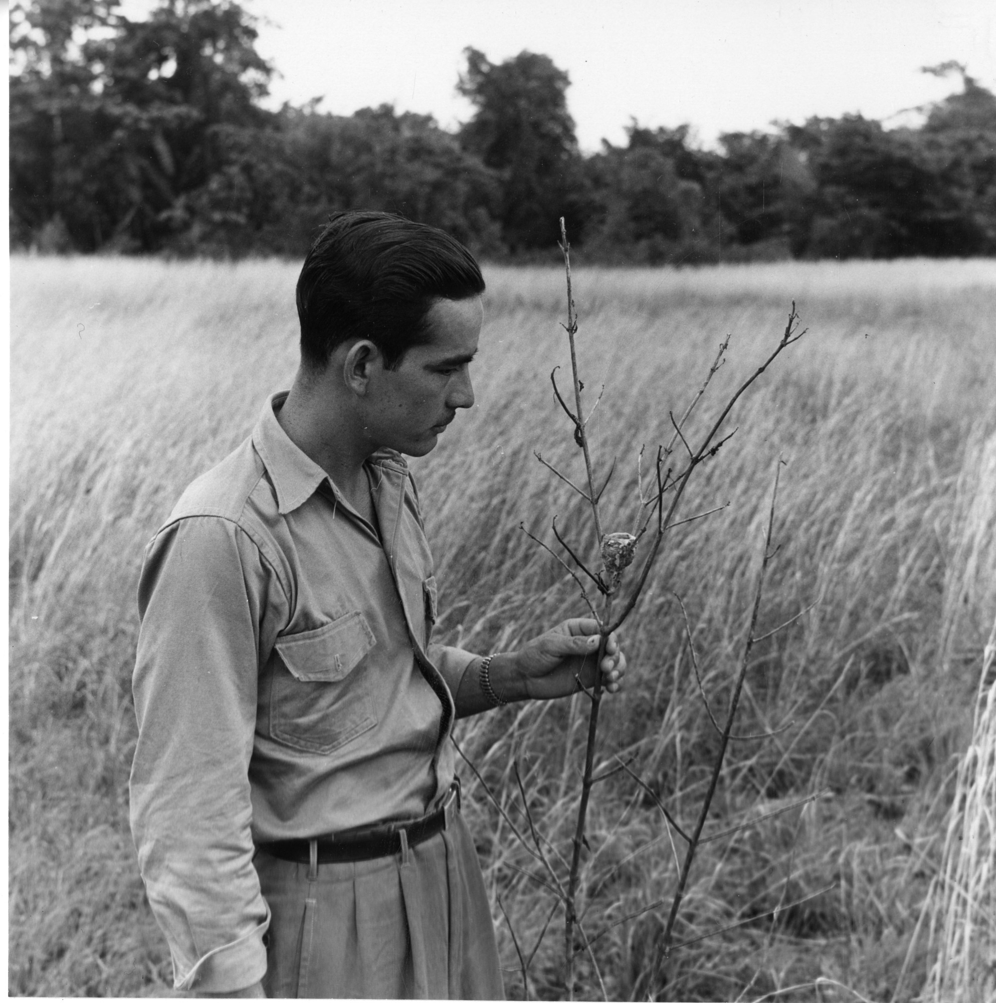 At Mandinga, San Blas, Armagedón Hartmann holds a branch of a tree where the nest of a lepidopyga (genus of hummingbird) has been built. The image was taken by Smithsonian Secretary and ornithologist Alexander Wetmore while on an ornithological expedition to Panama. Hartmann worked as a field guide for Wetmore on many of his expeditions.