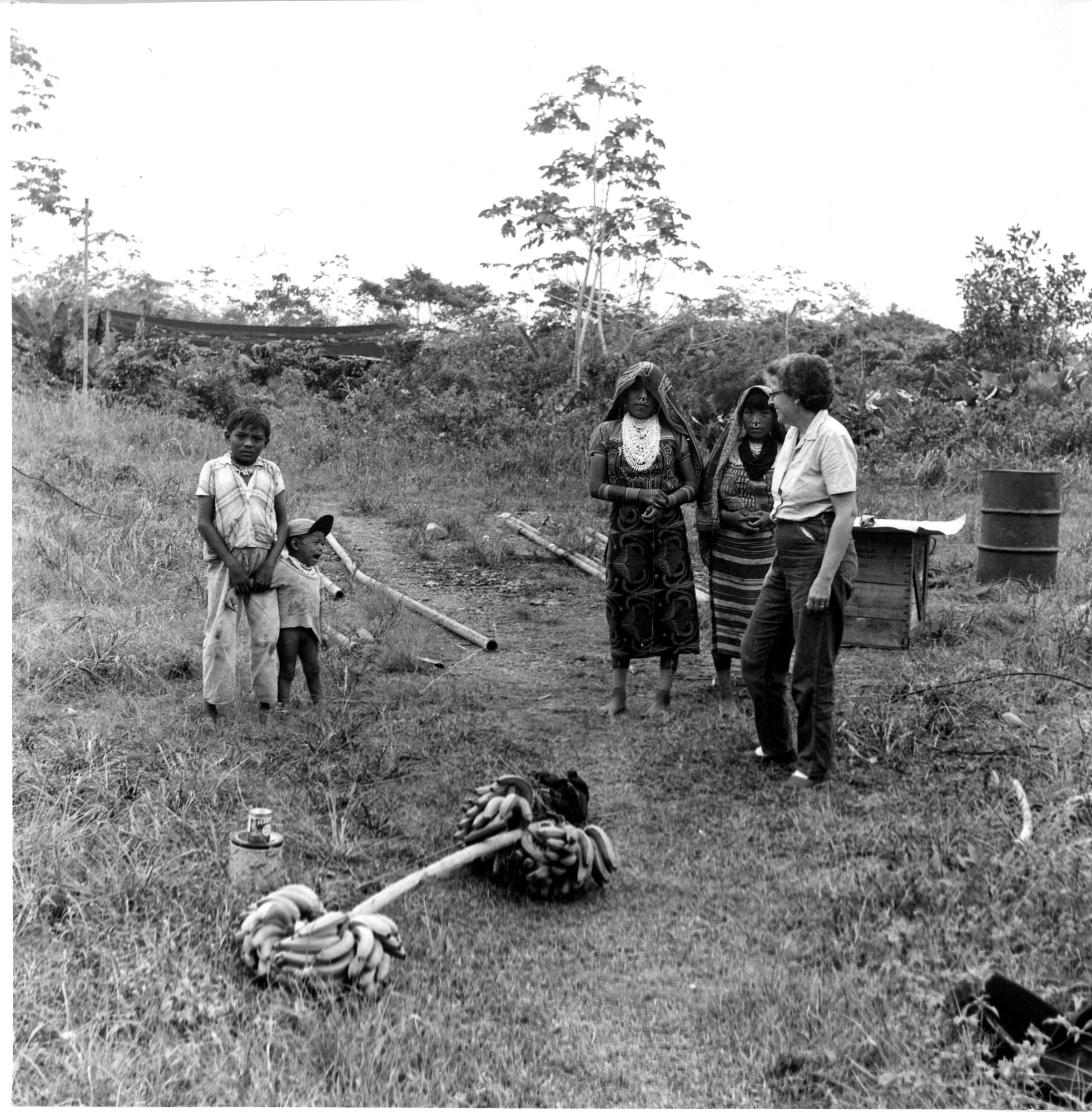 Bea Wetmore is in a field with Semy's family including two women dressed in native apparel and two children from the Isla Naranjo, San Blas, Panama. Bunches of bananas are lying on the ground at each end of a pole. The image was taken by Smithsonian Secretary and ornithologist Alexander Wetmore while on an ornithological expedition to Panama.