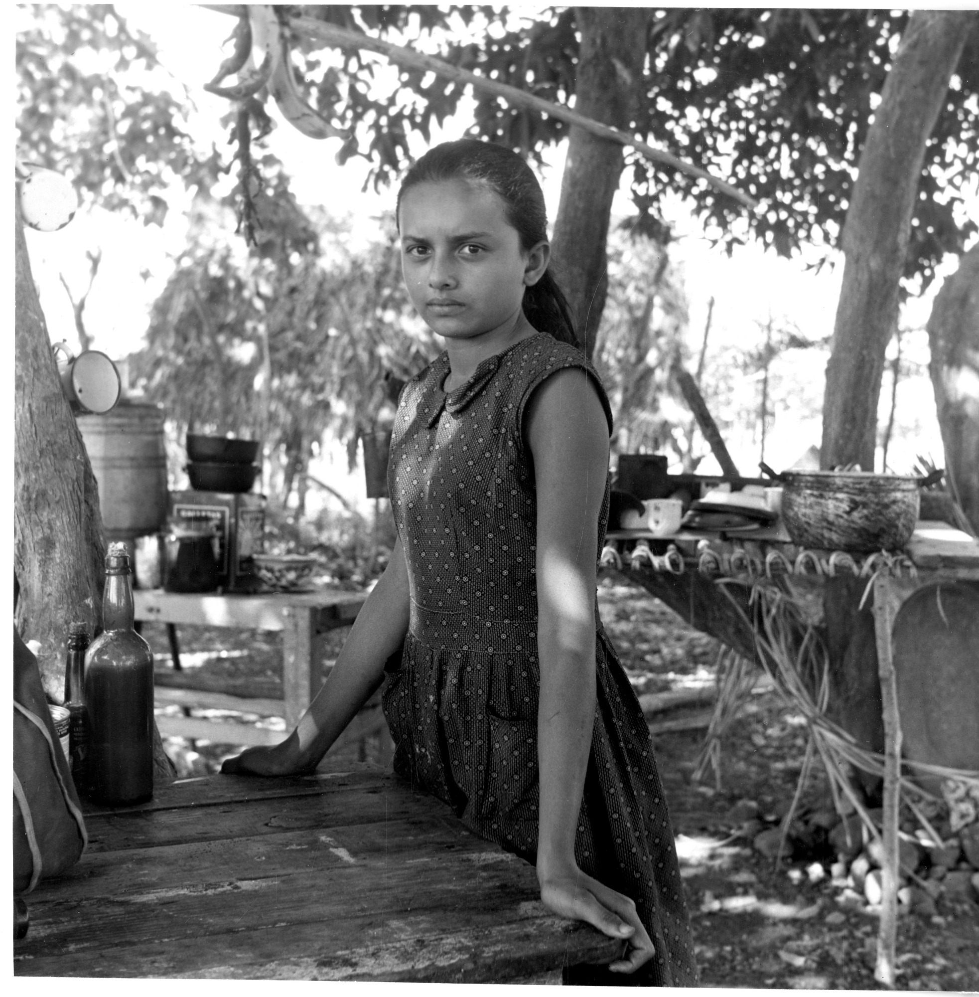 Carlos' sister leans against a table as she stands in the open air summer camp above the house on the Isla Iguana. Pots and pans and other objects are on other tables. The image was taken by Smithsonian Secretary and ornithologist Alexander Wetmore while on an ornithological expedition to Panama.