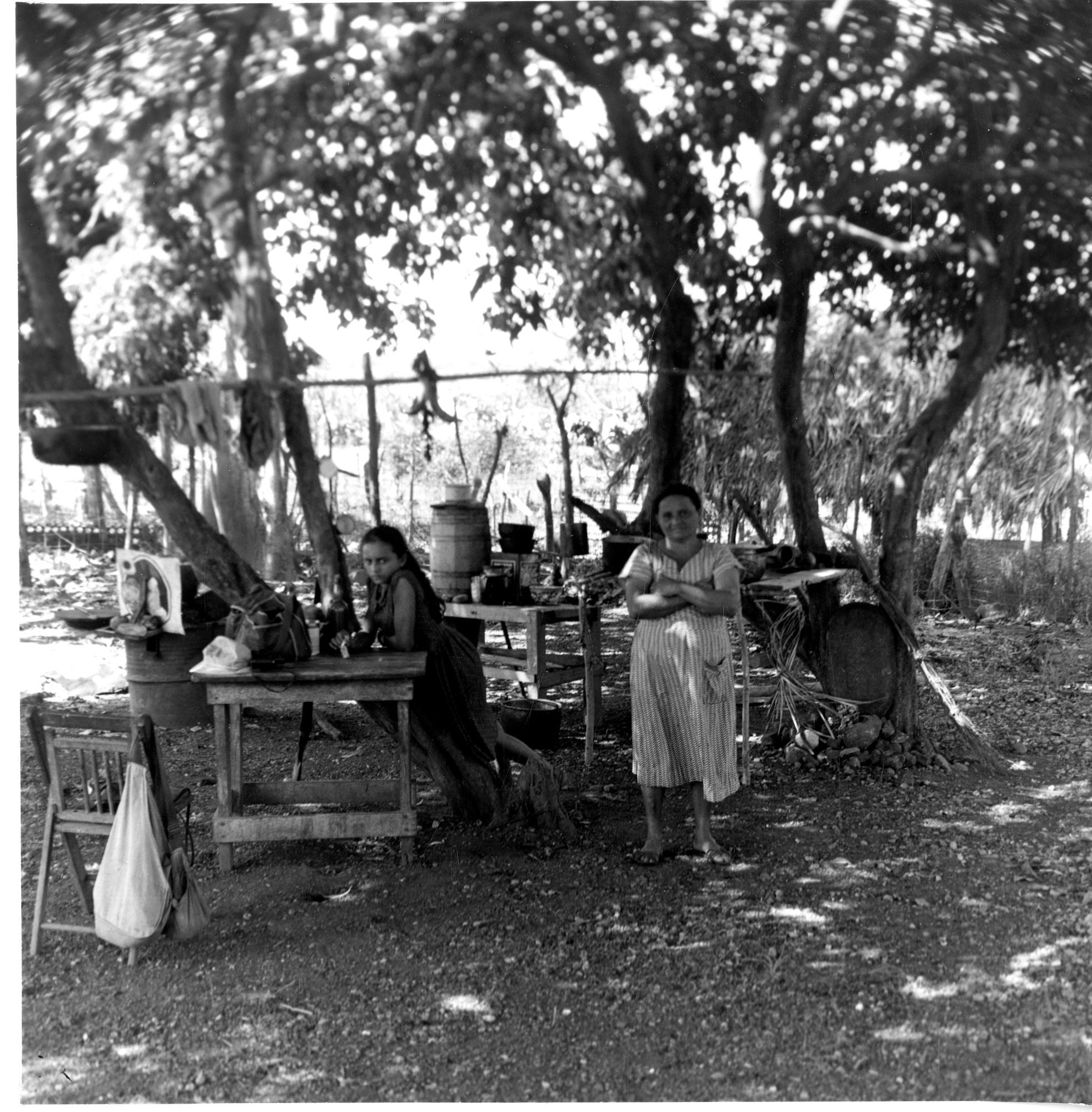 A woman and Carlos' sister, who is leaning against a table, are at the open air summer camp above the house on the Isla Iguana. Pots and pans and other objects are on other tables. The image was taken by sixth Smithsonian Secretary and ornithologist Alexander Wetmore while on an ornithological expedition to Panama.