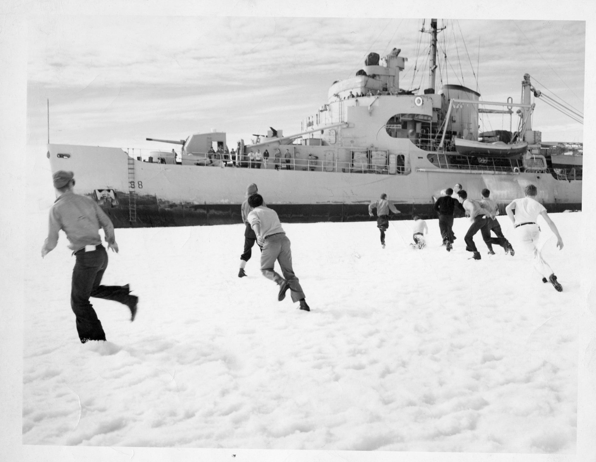 Image of Operation Windmill expedition members playing in the snow. Other members are standing on the ship watching the men on the ground. Operation Windmill (1947-1948) was an expedition established by the Chief of Naval Operations to train personnel, test equipment, and reaffirm American interests in Antarctica. The icebreaker in the background of the image is the USS Burton Island (AG-88), signified by the number 88 near the front of the Icebreaker. A second Icebreaker, the USS Edisto (AG-89) was also used during the expedition.