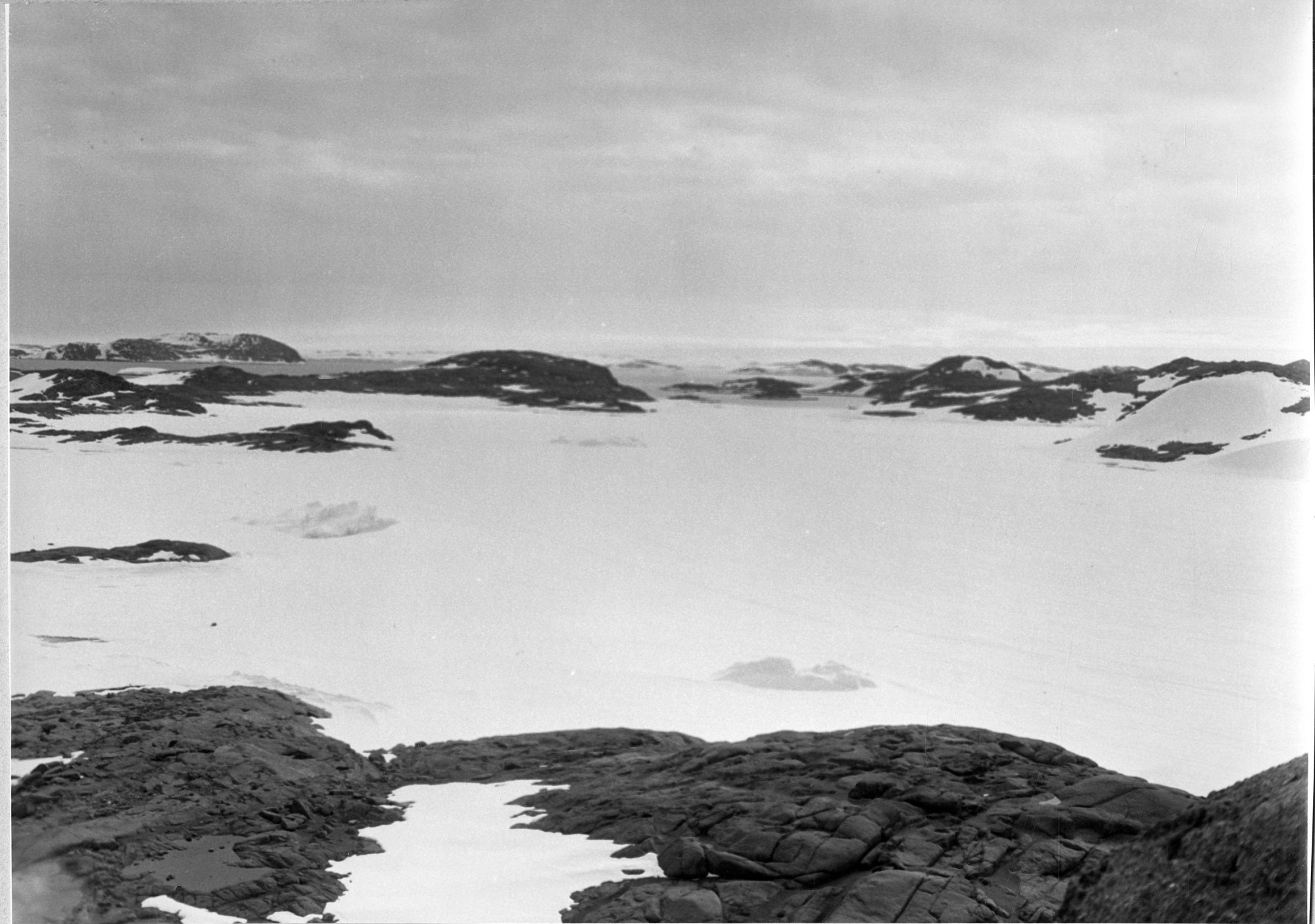 Image of the landscape of Antarctica with dark rocks amidst the snow and ice. The image was taken during Operation Windmill (1947-1948), an expedition established by the Chief of Naval Operations to train personnel, test equipment, and reaffirm American interests in Antarctica.