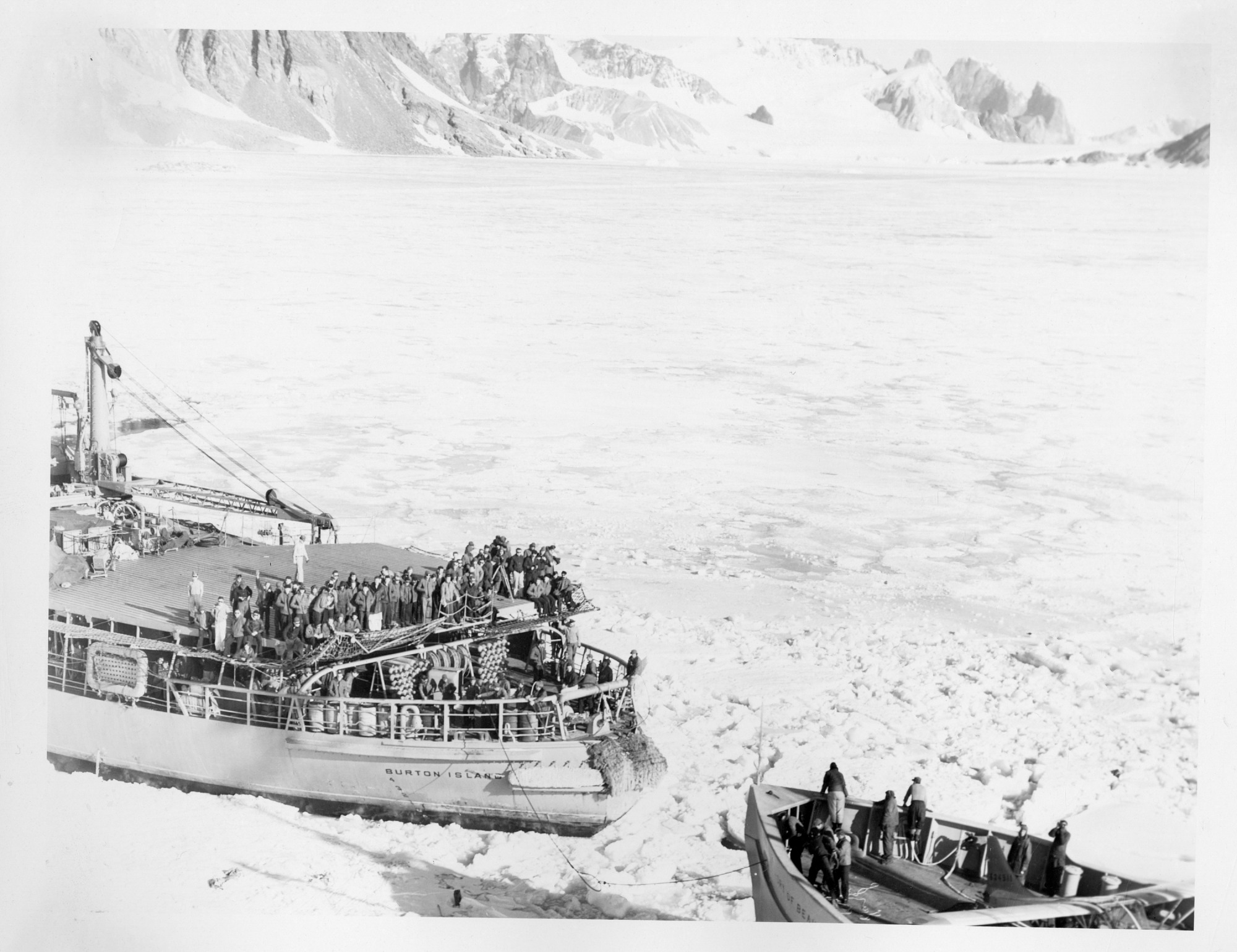 Image of the USS Burton Island (AG-88) and the USS Edisto (AG-89) breaking ice in Antarctica, for Operation Windmill. The USS Burton Island can be seen to the left of the image with the crew standing on deck. The USS Edisto is in the bottom of the image and it is connected to the USS Burton by a rope. The caption at the bottom of the image reads: "Operation Iceikle." Operation Windmill (1947-1948) was an expedition established by the Chief of Naval Operations to train personnel, test equipment, and reaffirm American interests in Antarctica.