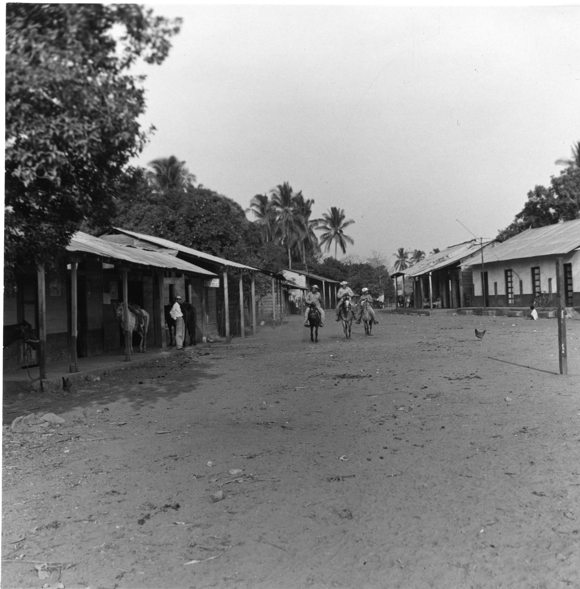 A street in Tonosí, Los Santos, Panama shows three men in the middle of the street riding horses. Another man is standing on the porch of a building on the left. More horses can be seen tied to posts and there is a chicken crossing the road.