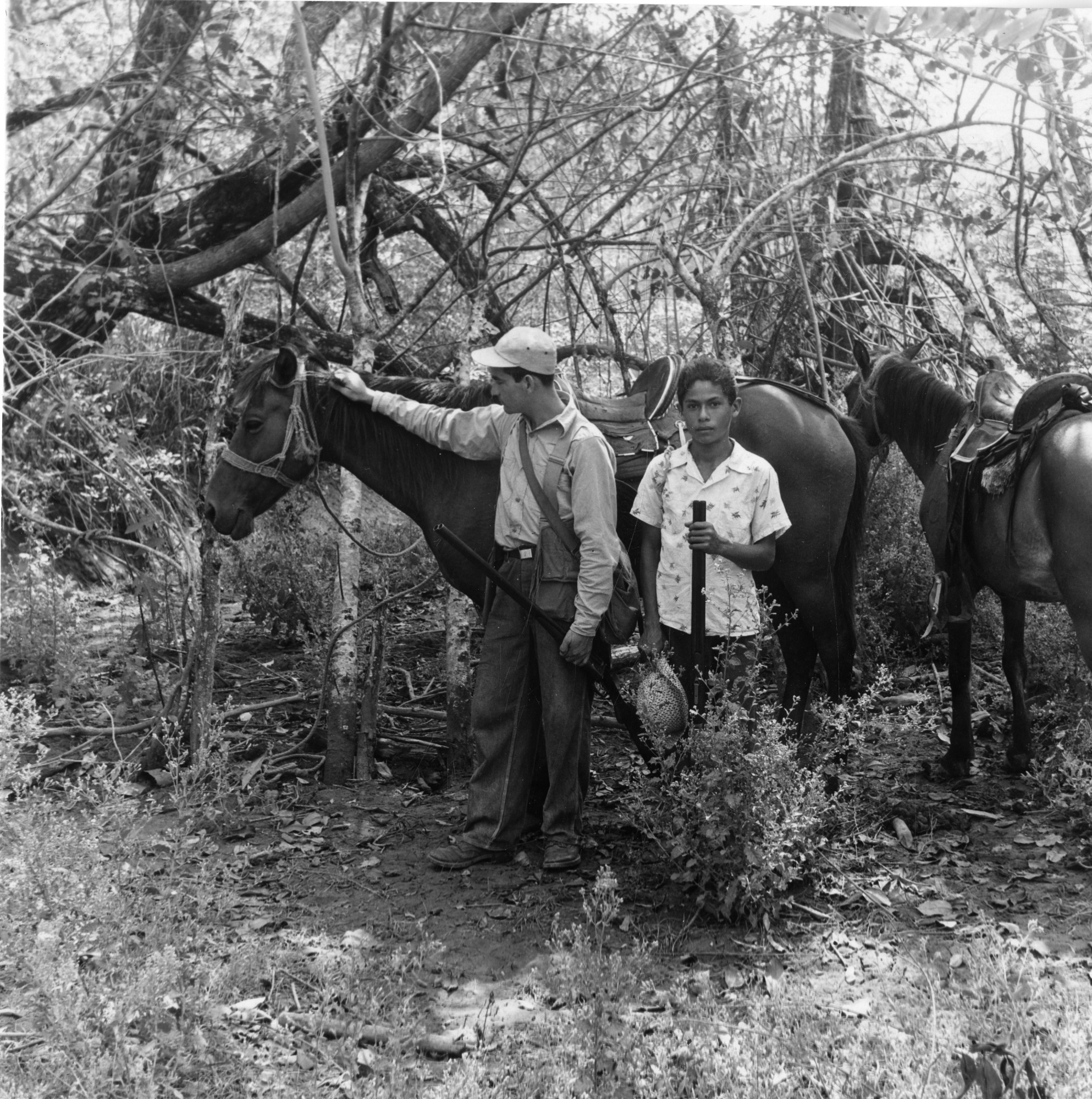 Armagedón Hartmann and Antonia stand with their horses at Puerto Piña, Panama. Armagedón and Antonio assisted sixth Smithsonian Secretary and ornithologist Alexander Wetmore while on a scientific expedition to Panama. The image was taken by Wetmore.