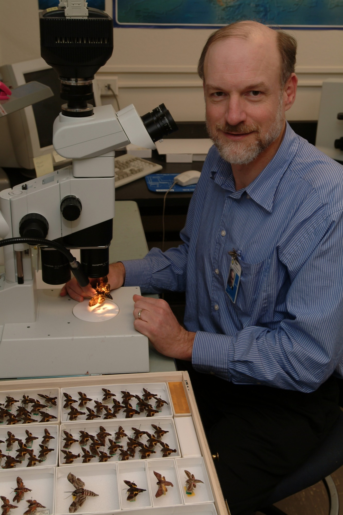 - Image of Dr. Scott Miller sitting at a microscope looking at moth specimens. Miller, an entomologist, received his bachelor's degree from the University of California at Santa Barbara and his doctorate degree in biology from Harvard University.