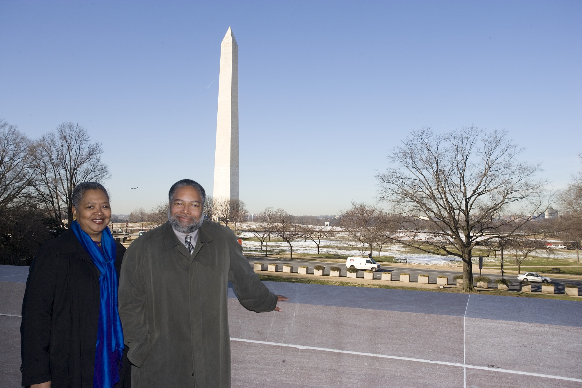 Director of the National Museum of African American History and Culture, Lonnie Bunch, with Deputy Director, Kinshasha Holman Conwill, has a hand on a wall as they view the site for the new Museum on the Mall. 15th Street and the Washington Monument are behind them.