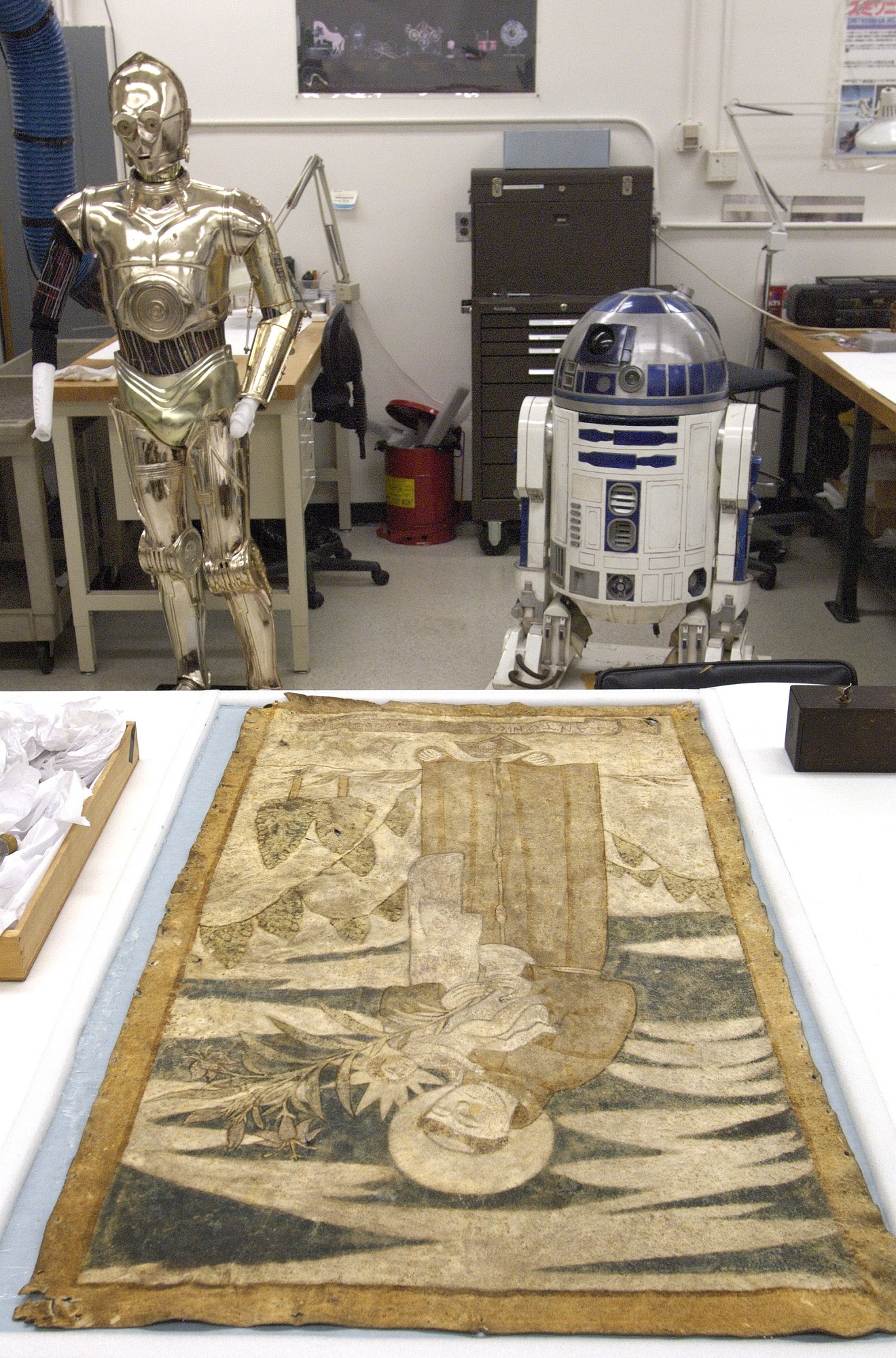 Items from the "Treasures of American History" are put on display as they are being prepared for their new exhibit. C-3PO and R2-D2, droids from the movie Star Wars, are in the center and a tapestry lies on the table. The exhibit includes iconic items from the National Museum of American History (NMAH) that will travel across the National Mall to the National Air and Space Museum while NMAH is undergoing renovations starting September 5, 2006.