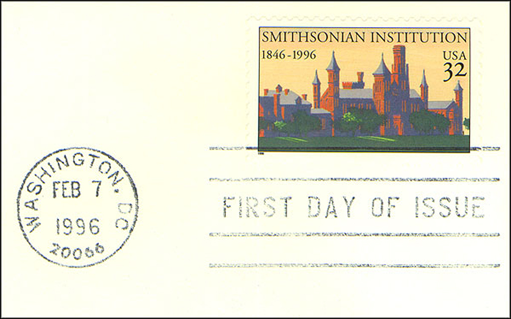 The new Smithsonian 150th Anniversary stamp. It was issued February 7, 1996 with a short ceremony in Baird Auditorium unveiling the stamp. Sheets of the new stamp and envelopes with first-day cancellations were available for sale in the Rotunda of the National Museum of Natural History.