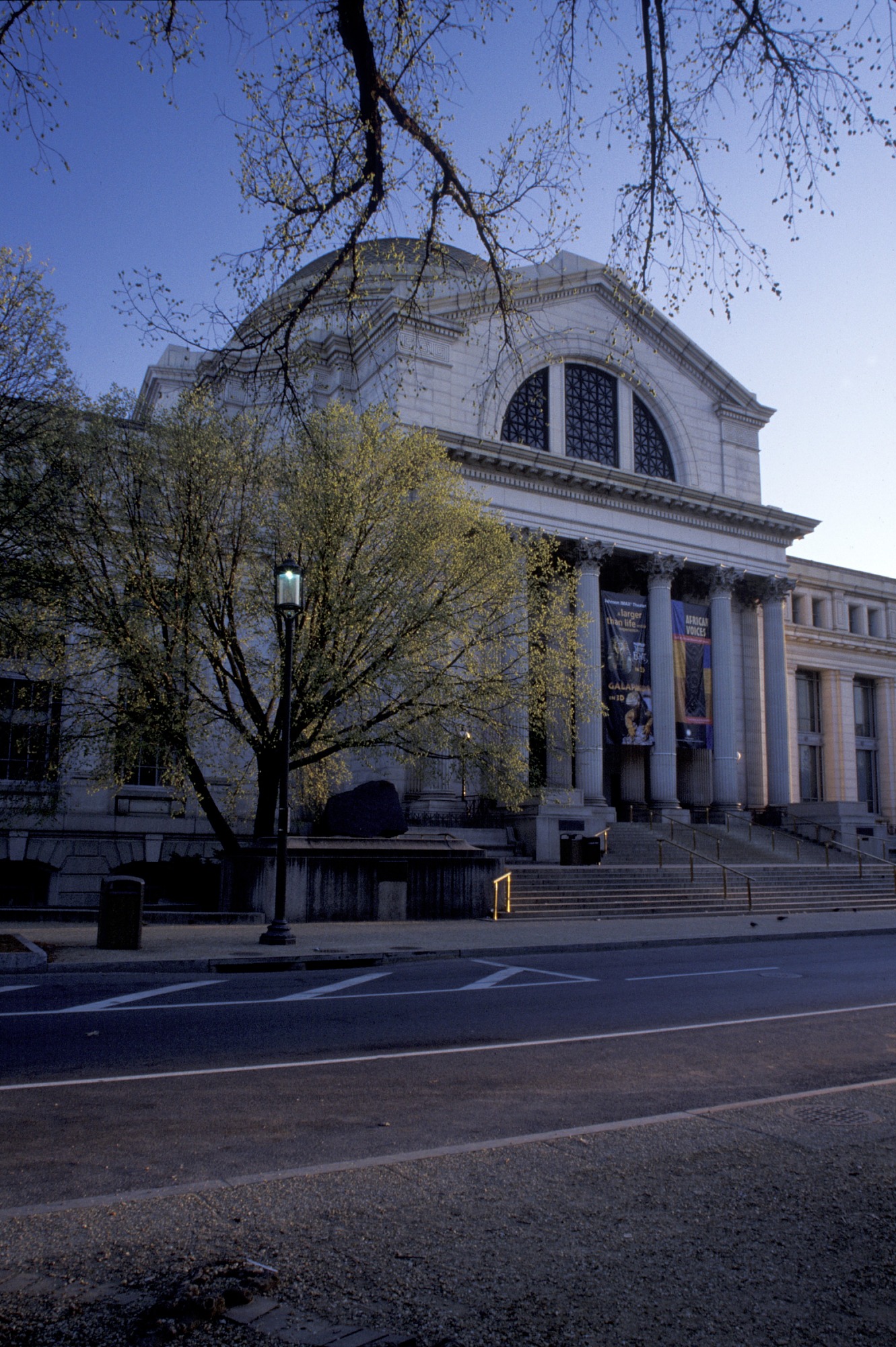 Image is of the entrance, that looks out onto the National Mall, of the National Museum of Natural History at sunrise in late March.