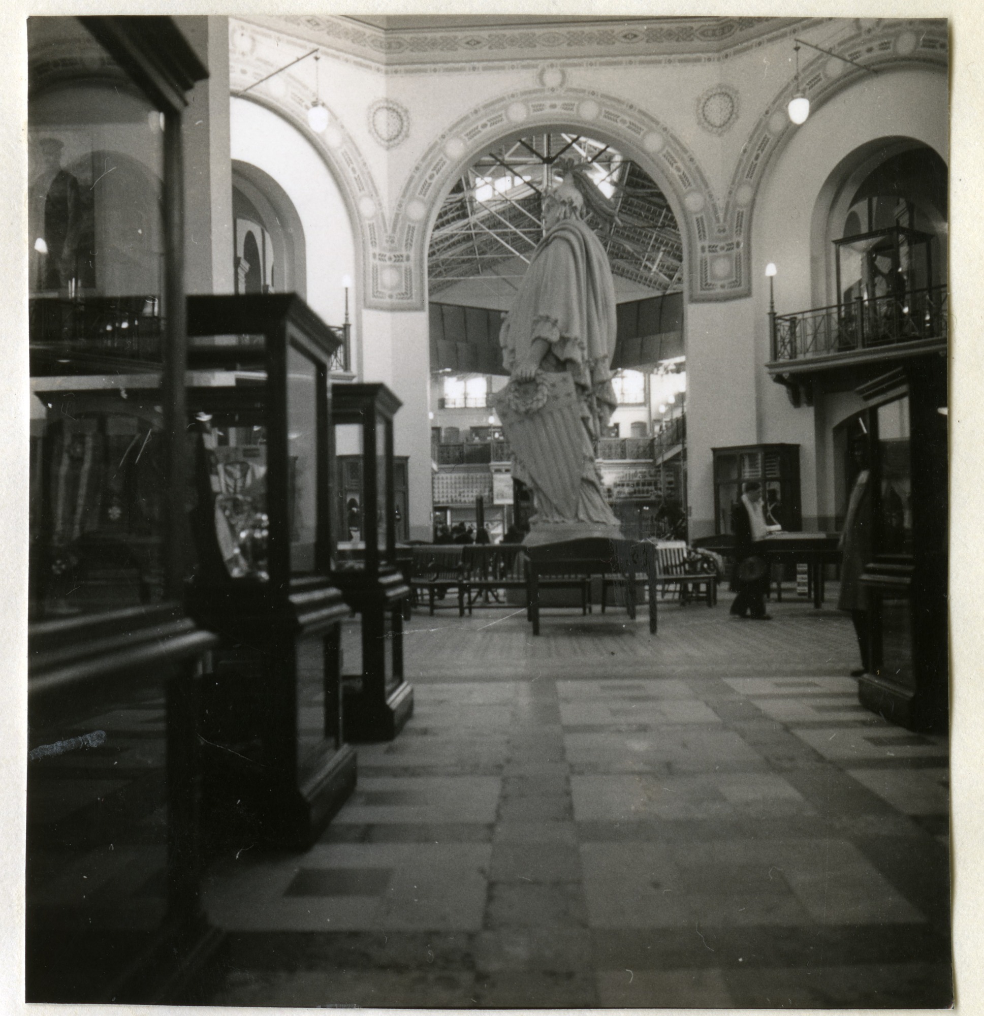 Interior of the Arts and Industries Building looking from the west wing toward the Rotunda, showing a side view of the Statue of Freedom. Benches on the floor of the Rotunda surround the statue. A museum visitor is on the right. Some exhibit cases can be seen in the west wing and in the Rotunda. One of the four balconies in the Rotunda and the balconies in the east wing are visible.