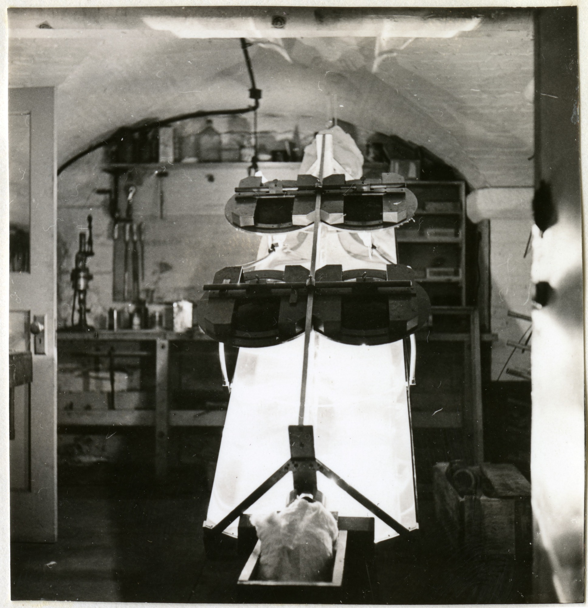 An experiment set up by the Division of Radiation and Organisms whose laboratory was located in the west end of the basement of the Smithsonian Institution Building, or "Castle', and a view of a wall of the laboratory.