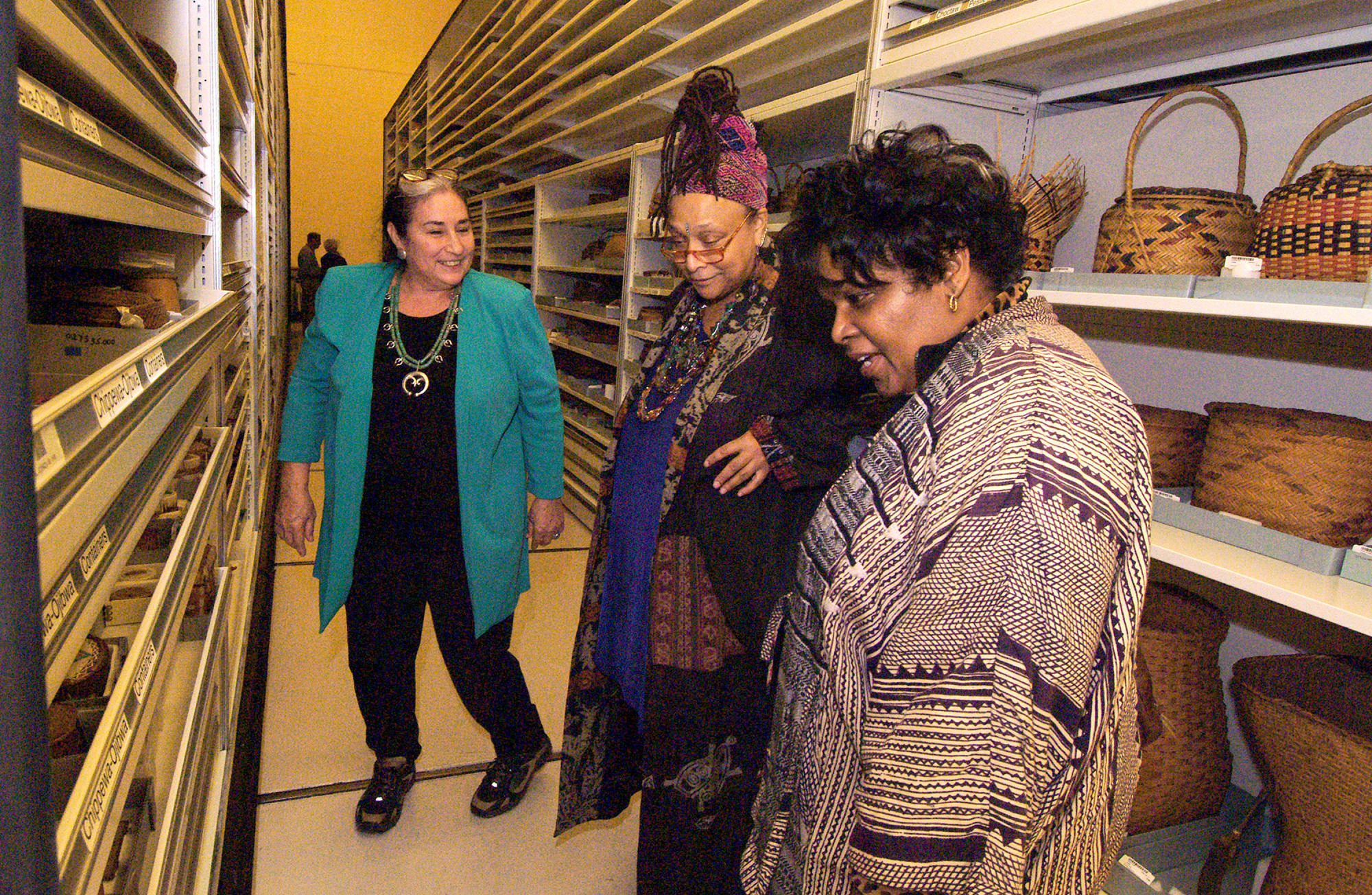 Family Day at the National Museum of the American Indian, Cultural Resources Center, with visitors viewing the collection storage area for baskets and other artifacts.