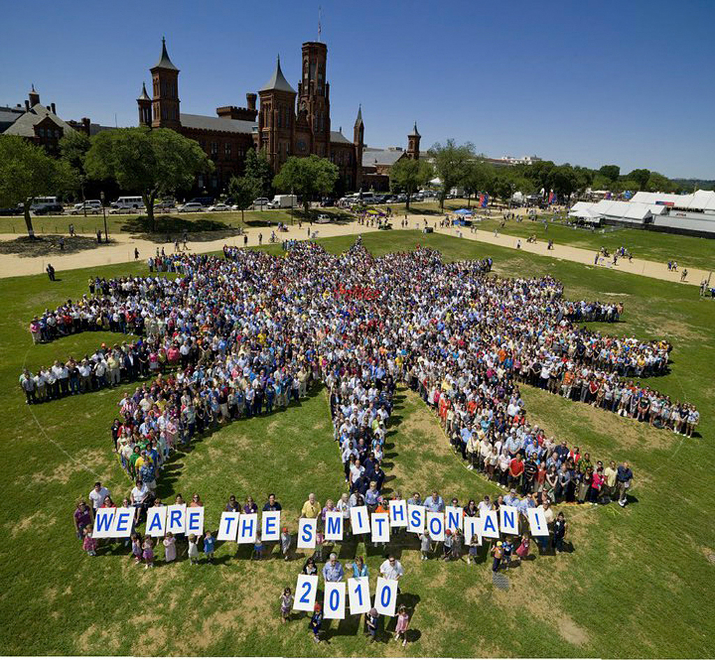 At the 2010 Smithsonian Staff Picnic on the National Mall, several thousand Smithsonian employees gathered for a group photograph in the shape of the Smithsonian's sunburst logo.