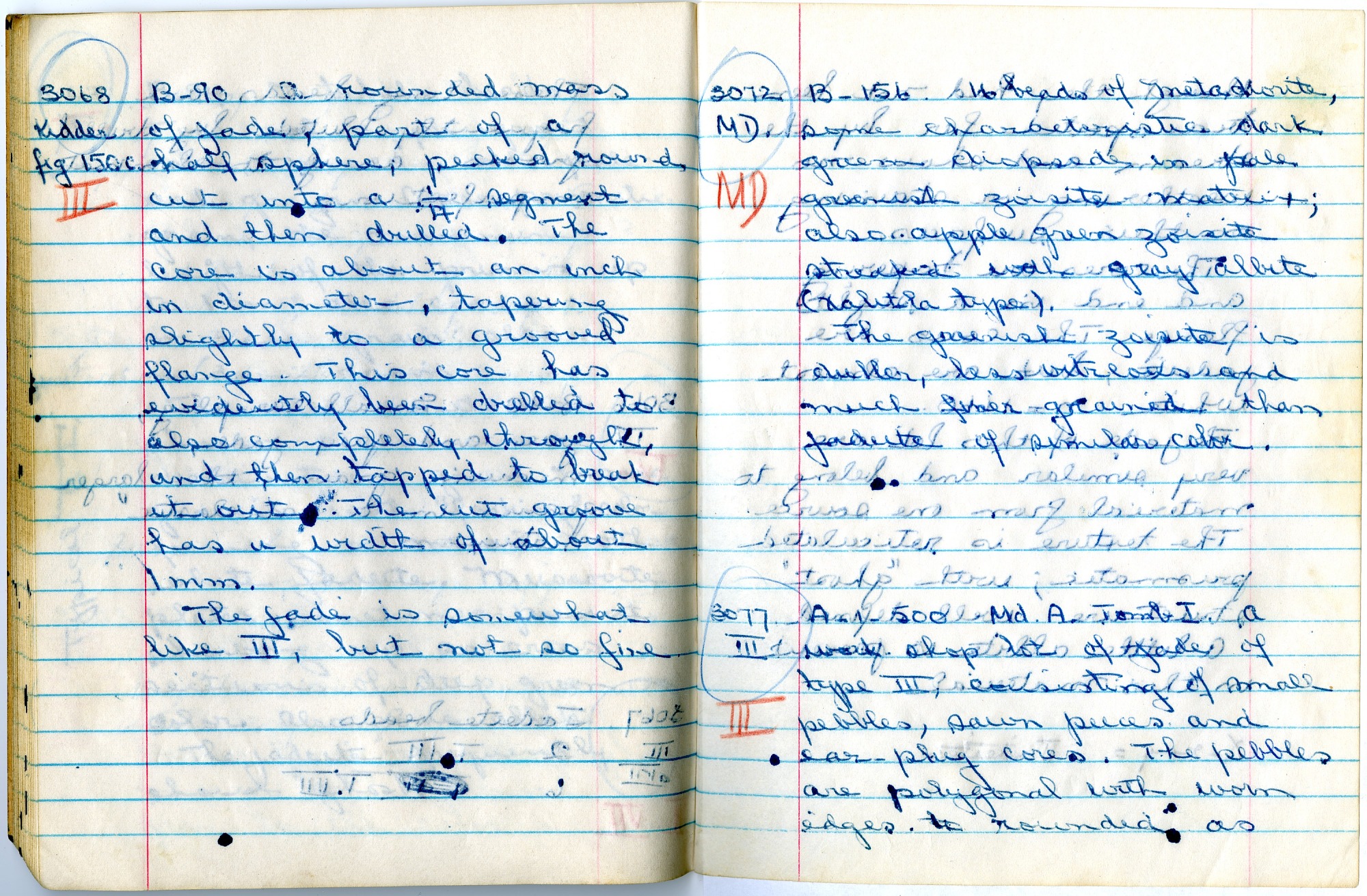 A notebook page highlighting specimens 3068, 3072, 3077 of the jade collected in Guatemala by William F. Foshag, curator in the Geology Department at the National Museum of Natural History. Foshag conducted an extensive survey of jade in Central America.