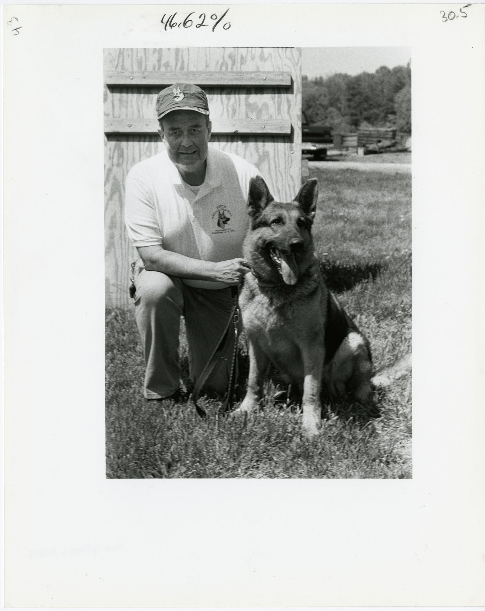 Don Bartel, trainer for the Smithsonian Institution's Office of Protective Services K-9 Unit, with Major, one of the K-9 Unit's finest. The first class, 6 dogs of German Shepherd descent, of the Smithsonian Canine Unit graduates at ceremonies held at the canine training grounds of Andrews Air Force Base on June 25, 1975.