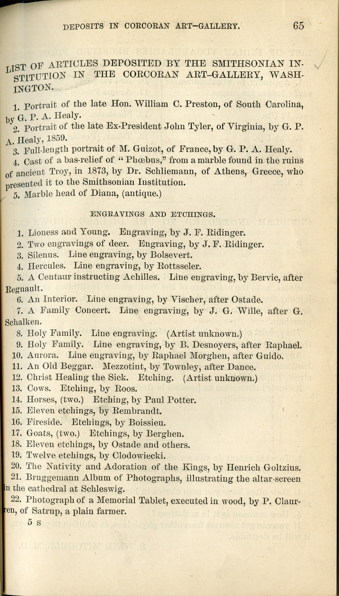 From the Smithsonian Institution's Annual Report from 1874, on page 65 is a list of articles (paintings, engravings, and other art works) deposited by the Smithsonian Institution in the Corcoran Gallery of Art in Washington, D.C. Secretary Joseph Henry was transferring the art collection to the Library of Congress and the Corcoran. The art collection transferred to Corcoran was later returned to the Smithsonian at the request of the Board of Regents (1896).