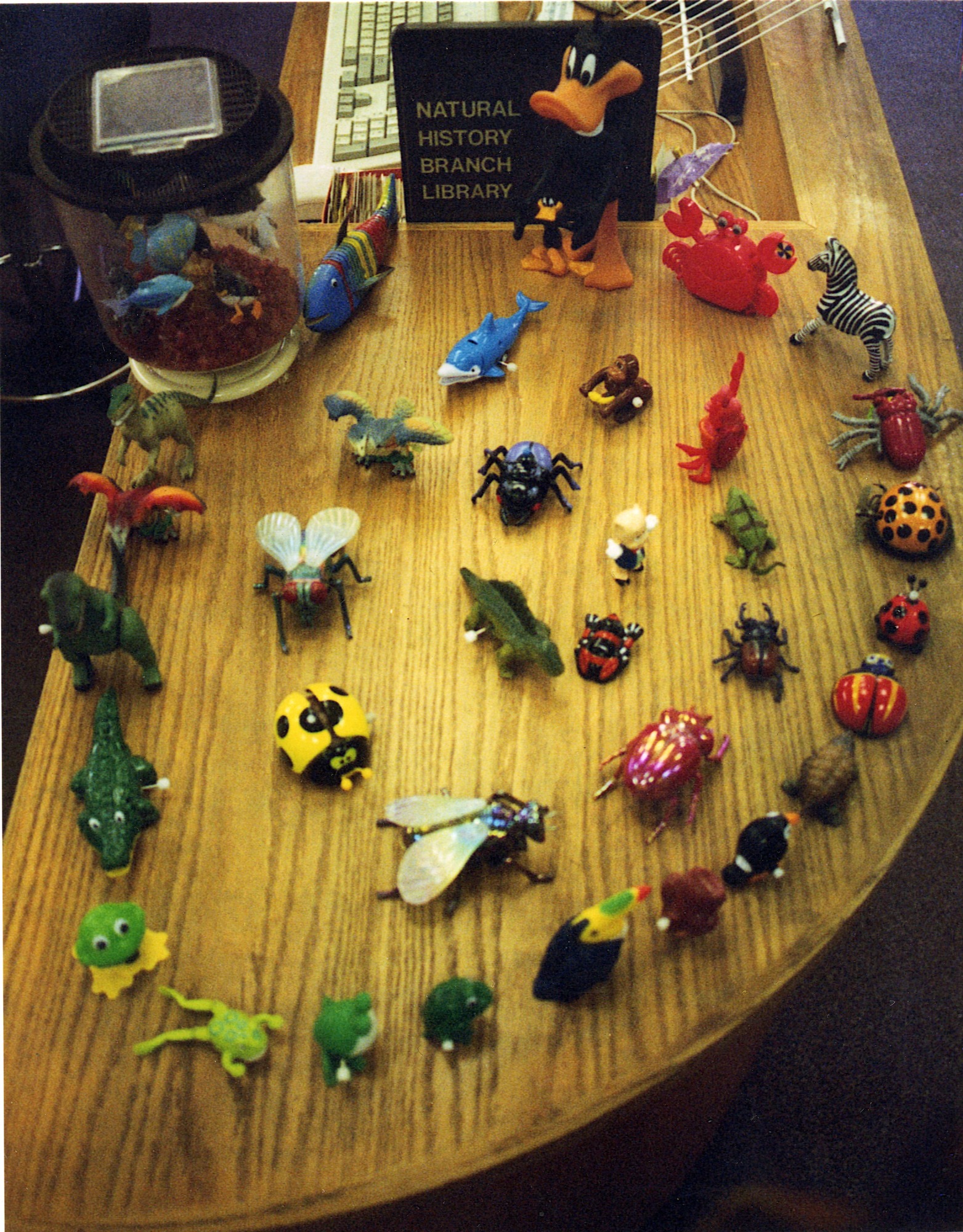 The circulation desk at the Natural History Library in the National Museum of Natural History. Natural History Librarian Martha Rosen captioned the photo, "This was when the collection fit on the Circulation desk." The desk is filled with mechanical bug and animal toys collected by Martha Rosen.