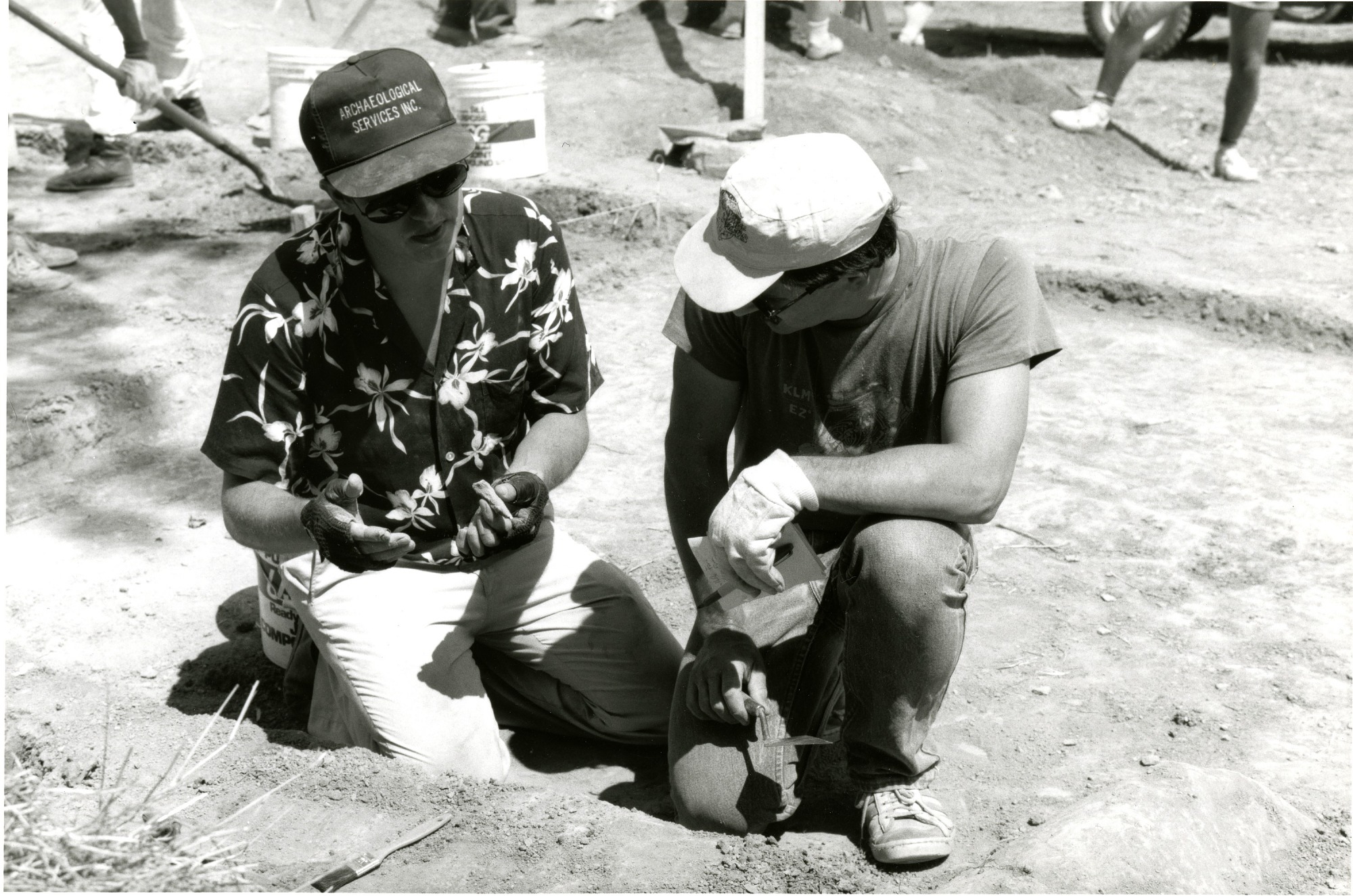 Curator Doug Owsley (left) and an archaeological dig team member examine a bone fragment unearthed at the Antietam battlefield. The National Museum of Natural History's Anthropology Department's Doug Owsley coordinated the dig with the National Park Service at the previously undiscovered Civil War battle site. Printed in the "Torch," October 1988.