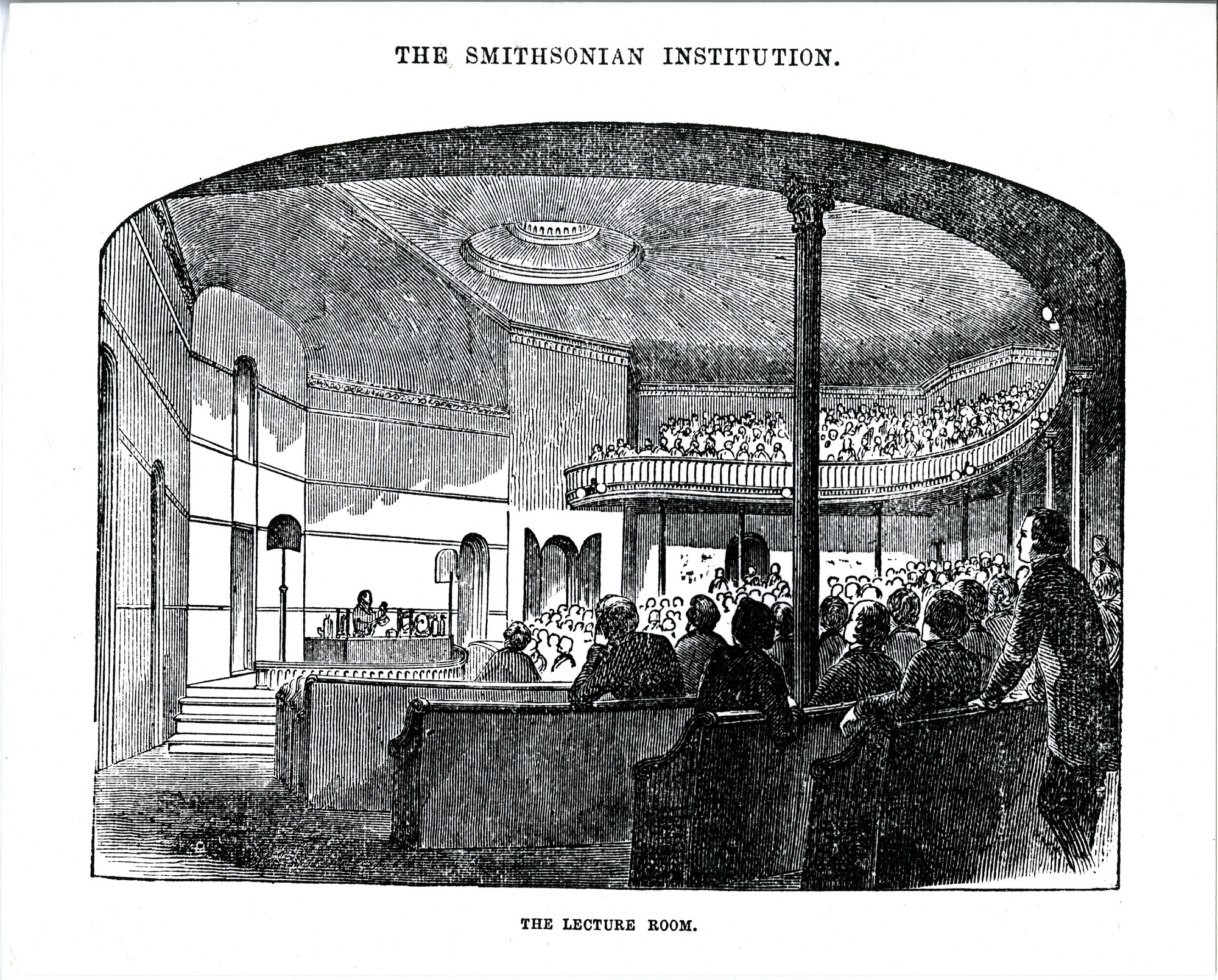 Engraving of the Lecture Hall in the Upper Main Hall of the Smithsonian Institution Building, or "Castle" shows an audience listening to a lecturer with demonstration using scientific apparatus. The engraving was published in the Smithsonian Guidebook of 1857. Pew-like bench seats held over 1,500 attendees. The Hall was used from 1855-1865 until the fire of 1865 destroyed all the upper rooms of the building. The lecture room was used for scientific demonstrations, free public lectures, meetings and concerts. The design of the room afforded clear sight-lines and evidently superb acoustics. There is both a lower area and a balcony area.