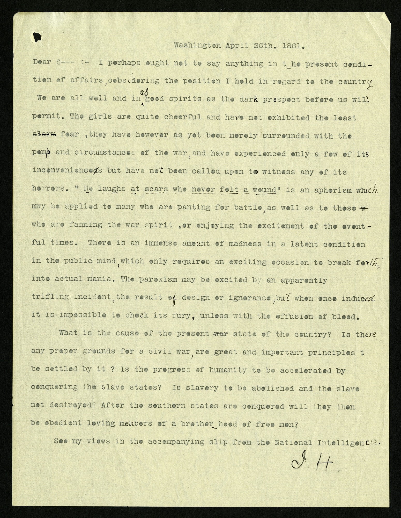 Letter from Joseph Henry, first Secretary of the Smithsonian Institution, to Stephen Alexander, his brother-in-law, April 26, 1861. In the letter, Henry describes the Civil War's effect on his daughters, Mary, Caroline, and Helen, and expresses worry about the unknown future of the United States. Henry and his family lived in the Smithsonian Institution Building, or "Castle," in the center of Washington, D.C., where many effects of the war were felt.