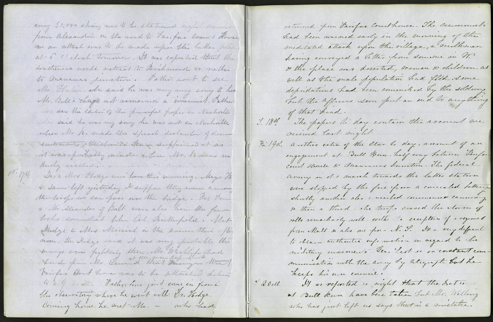 Entry from the diary of Mary Henry, daughter of Joseph Henry, first Secretary of the Smithsonian Institution, describing the First Battle of Manassas, in Virginia, of the United States Civil War. In the entries, Mary describes the troop movements prior to the battle, the battle and its effects in Washington, D.C.