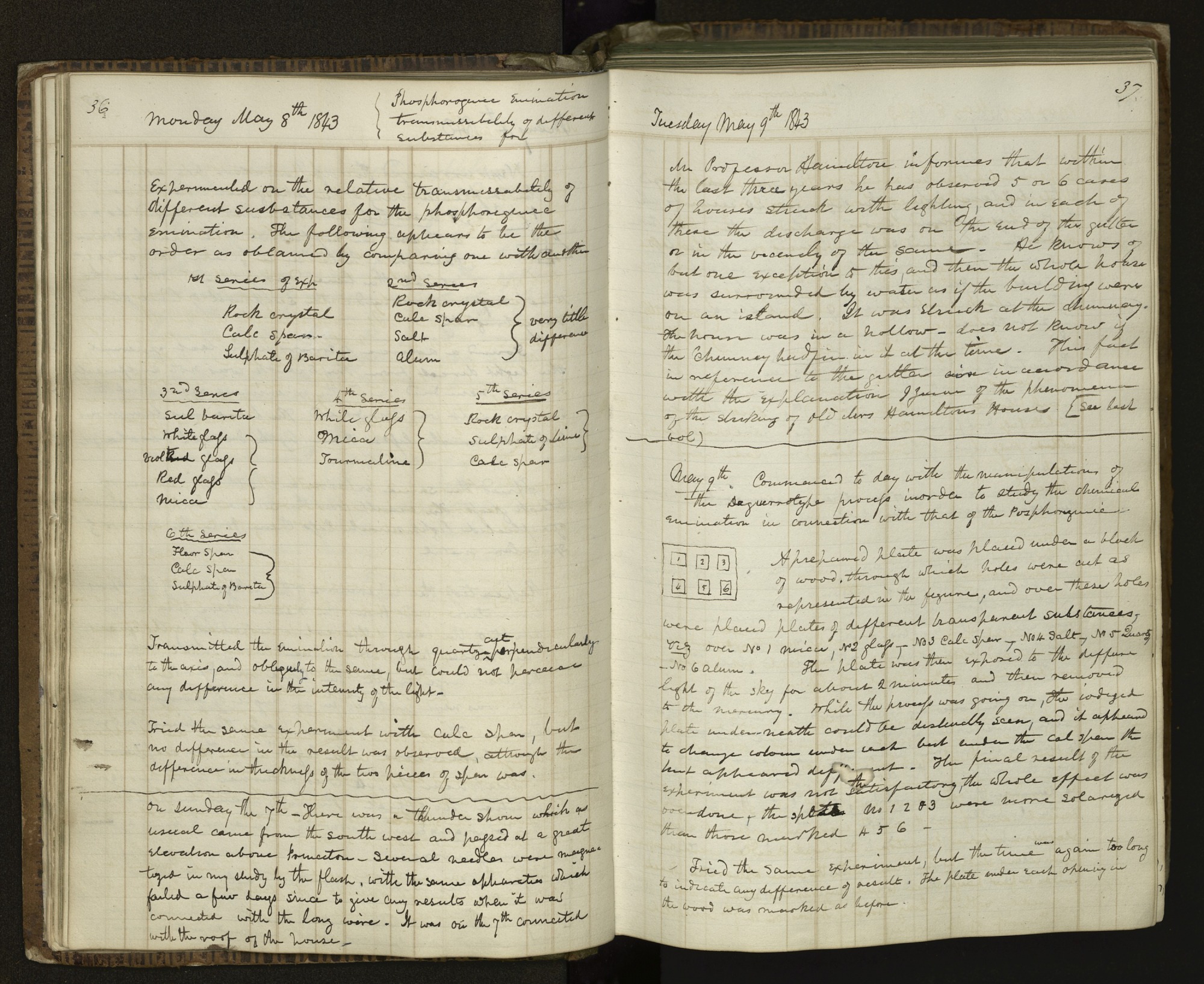 Record of experiments of Joseph Henry, then a professor at Princeton University and later first Secretary of the Smithsonian Institution, May 8, 1843. In the record, Henry describes an experiment, in which he tested the transmission of "phosphorogenic emination [sic]" through different rocks and minerals and another experiment, in which he experimented with using lightning rods to magnetize needles.