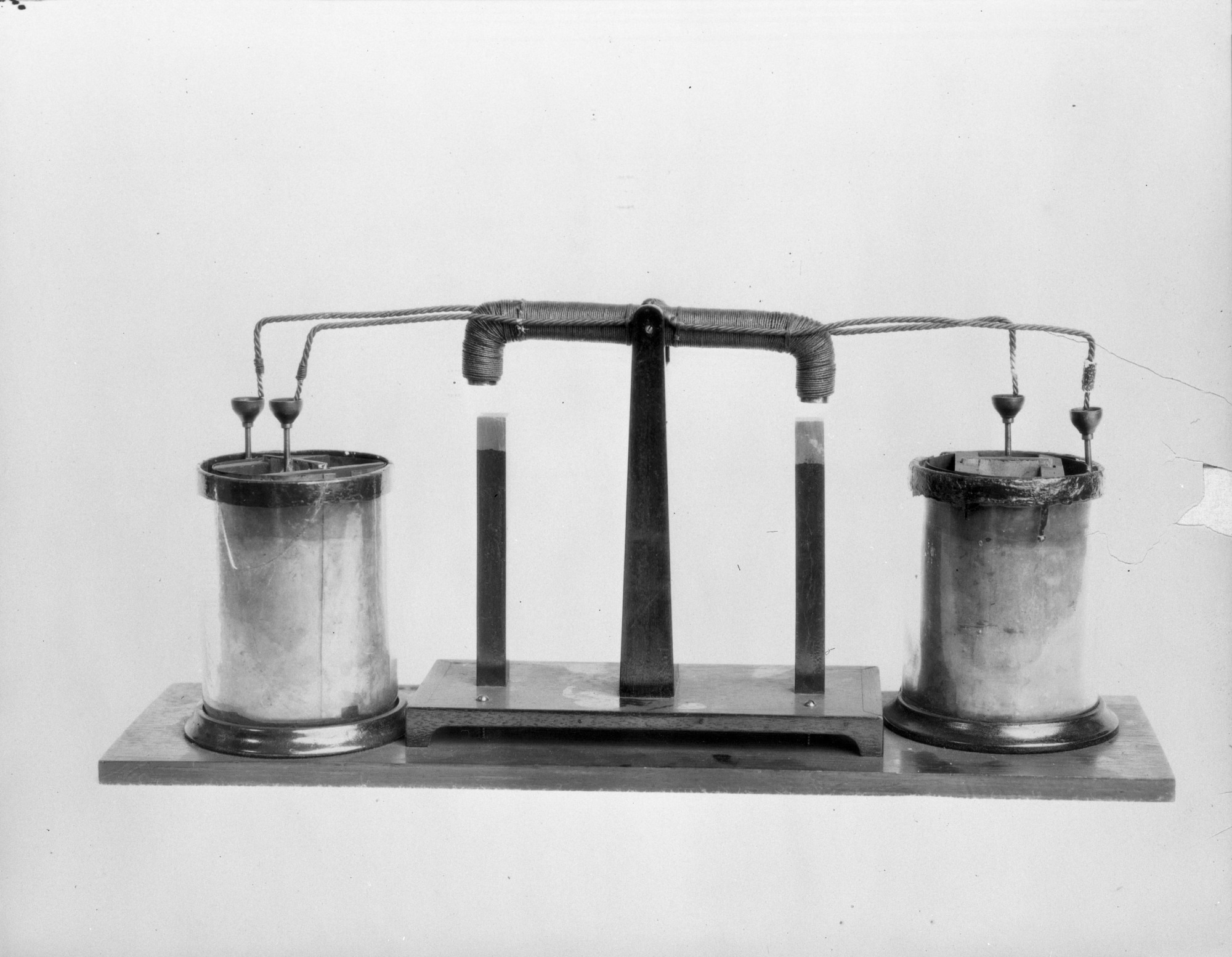 Reconstruction of Joseph Henry's original oscillating electromagnet motor, which he had first constructed at Princeton University in the 1830s. The motor was a simple device whose moving part was a straight electromagnet rocking on a horizontal axis. Henry, who would later become the first Secretary of the Smithsonian Institution, believed his machine was important as the first demonstration of continuous motion produced by magnetic attraction and repulsion.