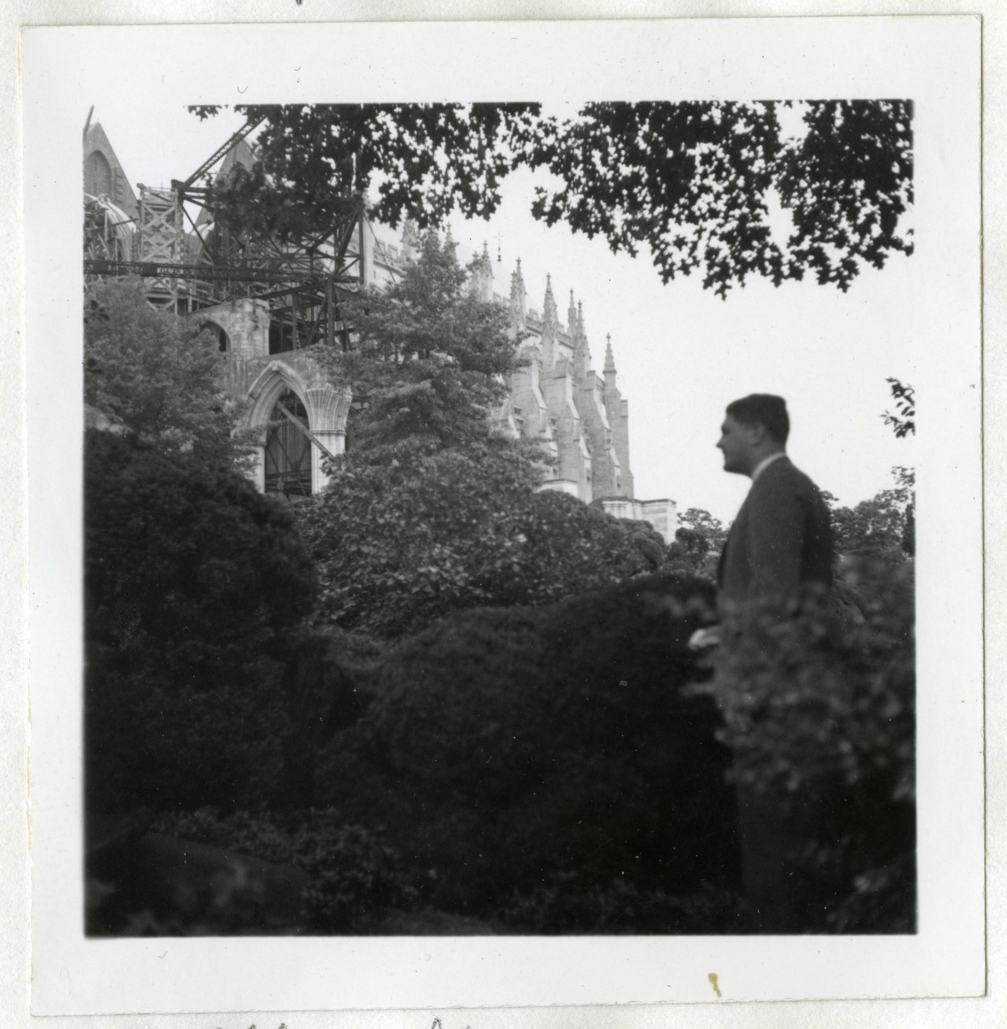 Image of a man standing in a garden area. Washington National Cathedral is in the background of the image. The cathedral has tall spires and has construction equipment around the left of the building.