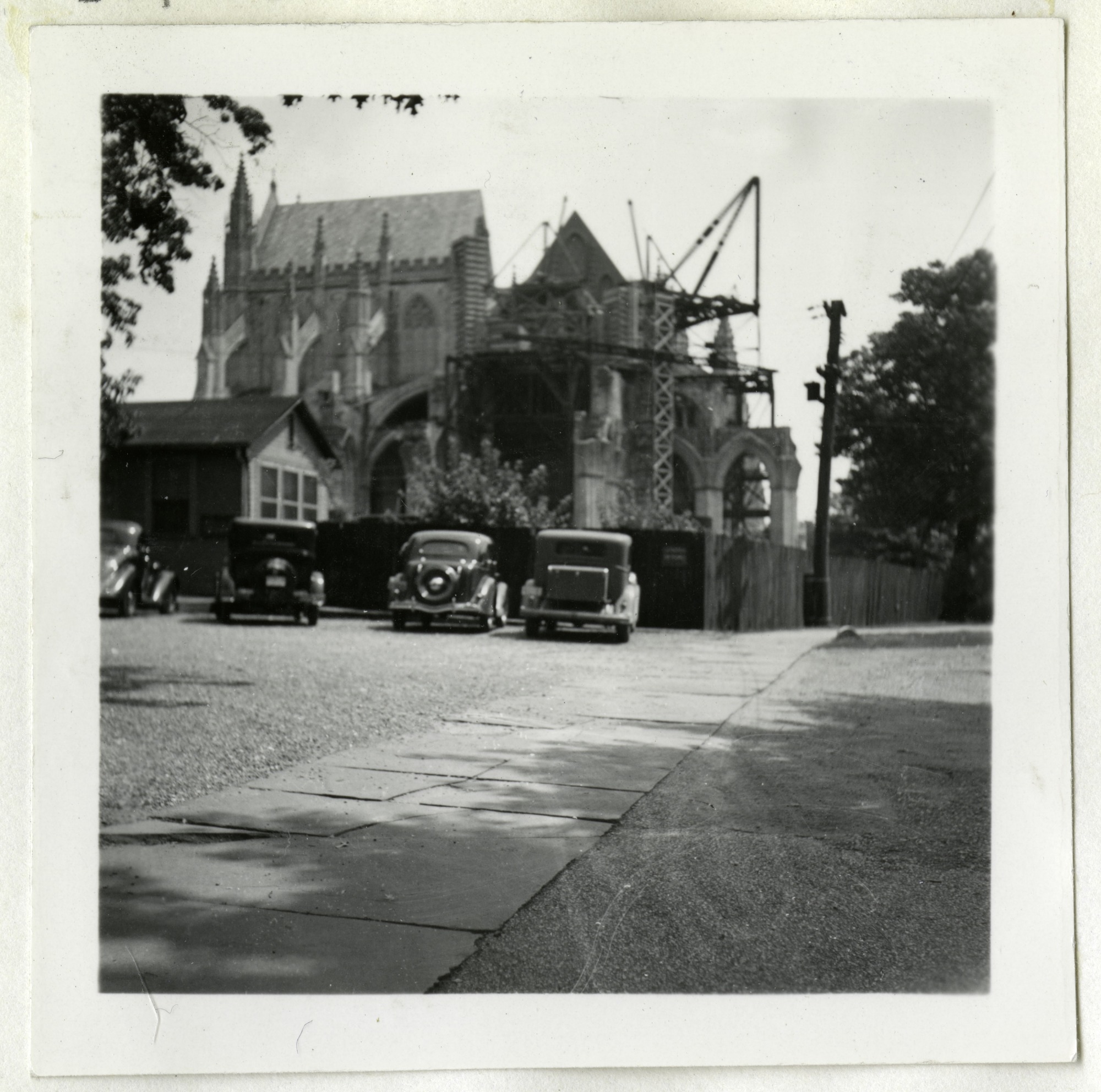 Image of Washington National Cathedral. Cars are parked in a lot and construction equipment can be seen surrounding the cathedral. A smaller building is in the parking lot and a sidewalk stretches beyond the building.