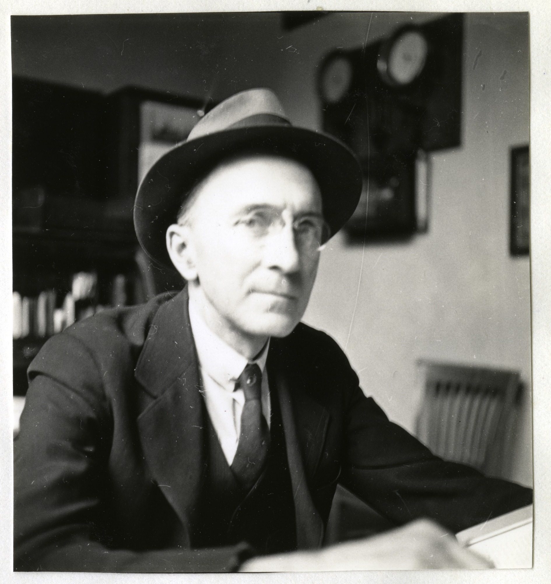 Image of Mr. C. R. (Clayton Rhay) Denmark sitting in an office. Mr. Denmark, an engineer for the United States National Museum, was in charge of a force of mechanics who maintained and repaired equipment. He worked at the Smithsonian from 1909 to 1940. He received his B.S. in 1907 from the Massachusetts Institute of Technology.