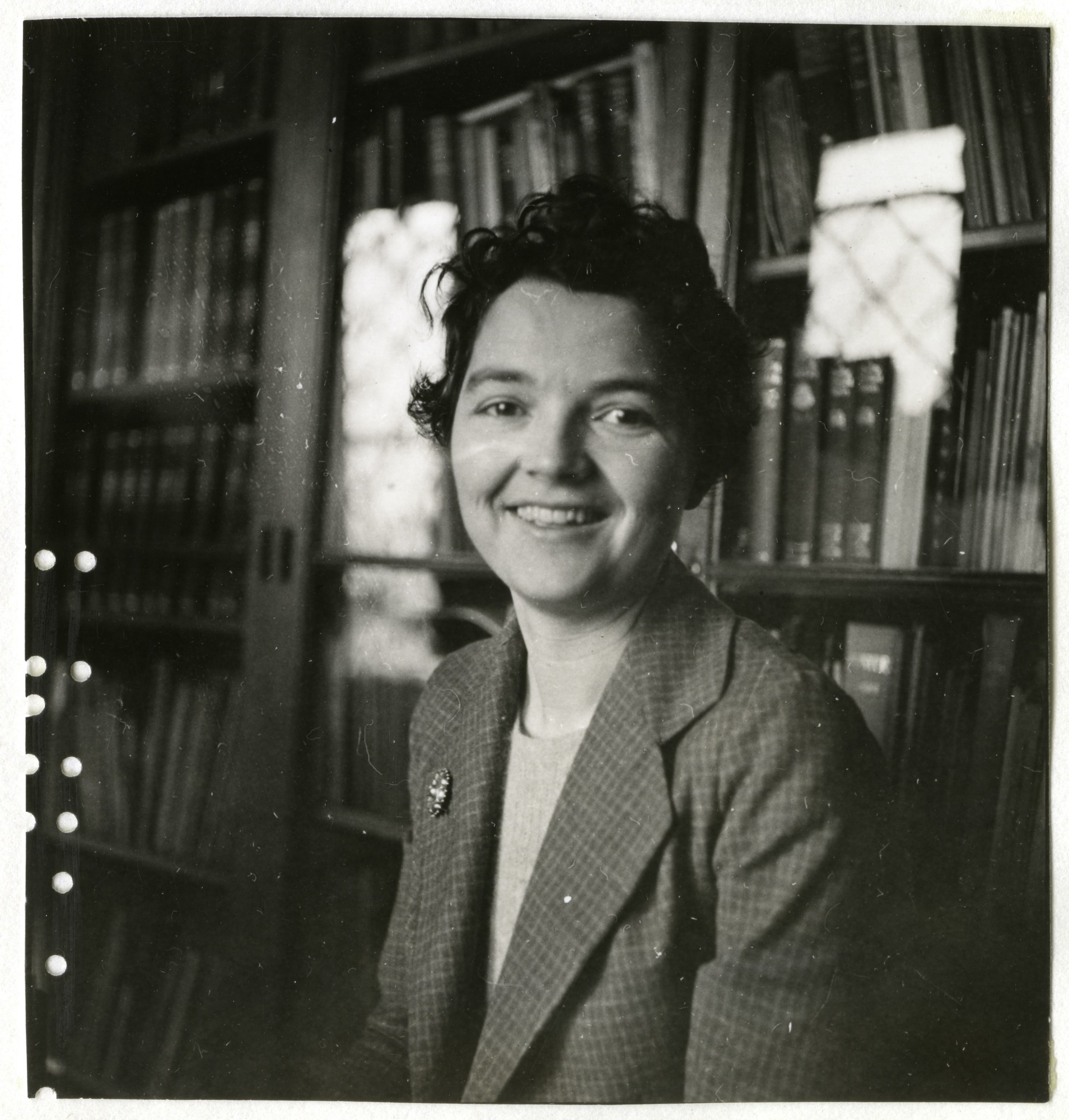 - Image of Mrs. Thomas Brockway (Rosamond Jean Lambert) (1899-1992), art historian, sitting in front of filled bookcases, probably in the Smithsonian "Castle", as she looks at the photographer .