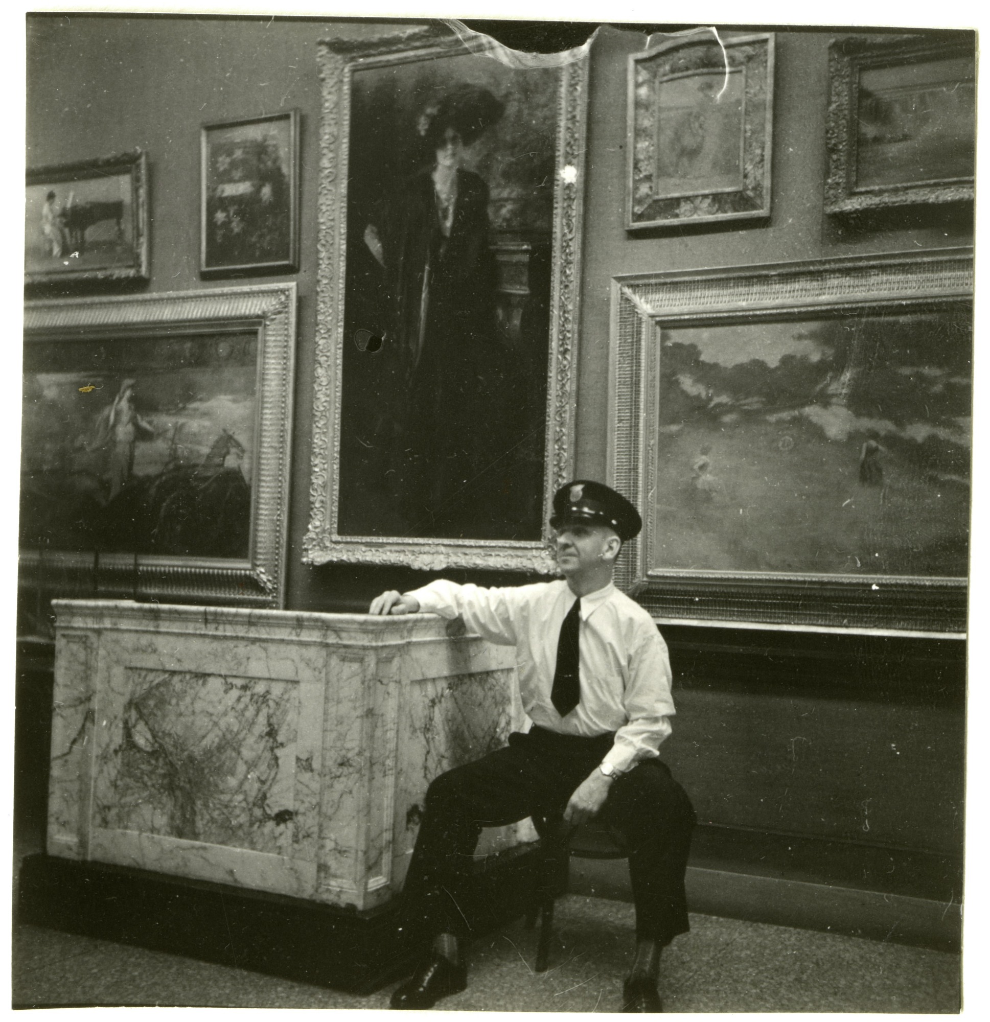 In the United States Museum of Natural History, now known as the National Museum of Natural History, Mr. Richard R. Chaney is sitting on a bench in front of a wall exhibiting paintings. Chaney is wearing a guard's uniform.