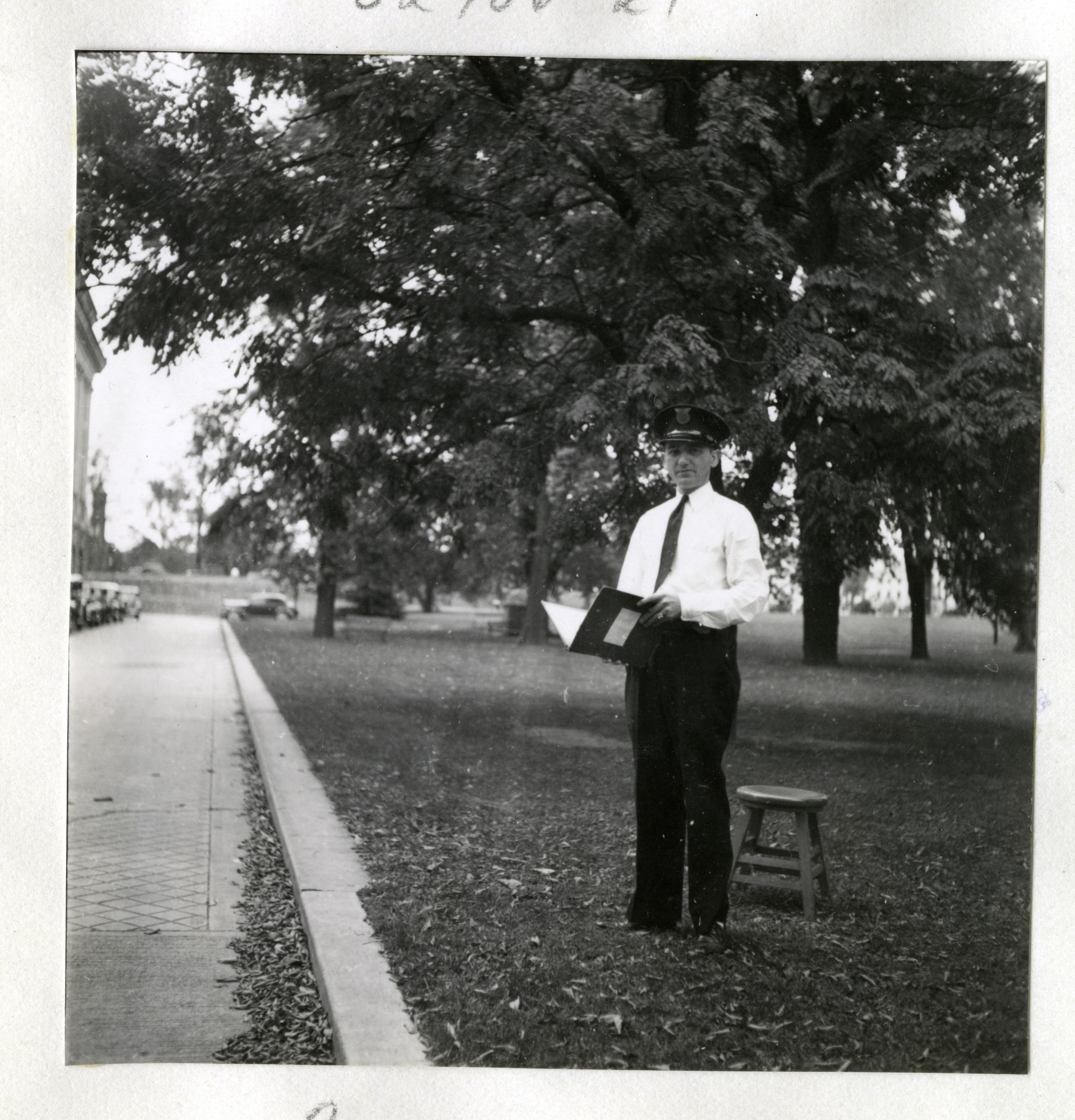 - Image of a man identified as Cecil R. Mulnix is standing outside on the Mall, Washington, D.C., in a guard's uniform, holding a book. A stool is near him on ground. In the distance on the left are parked automobiles.