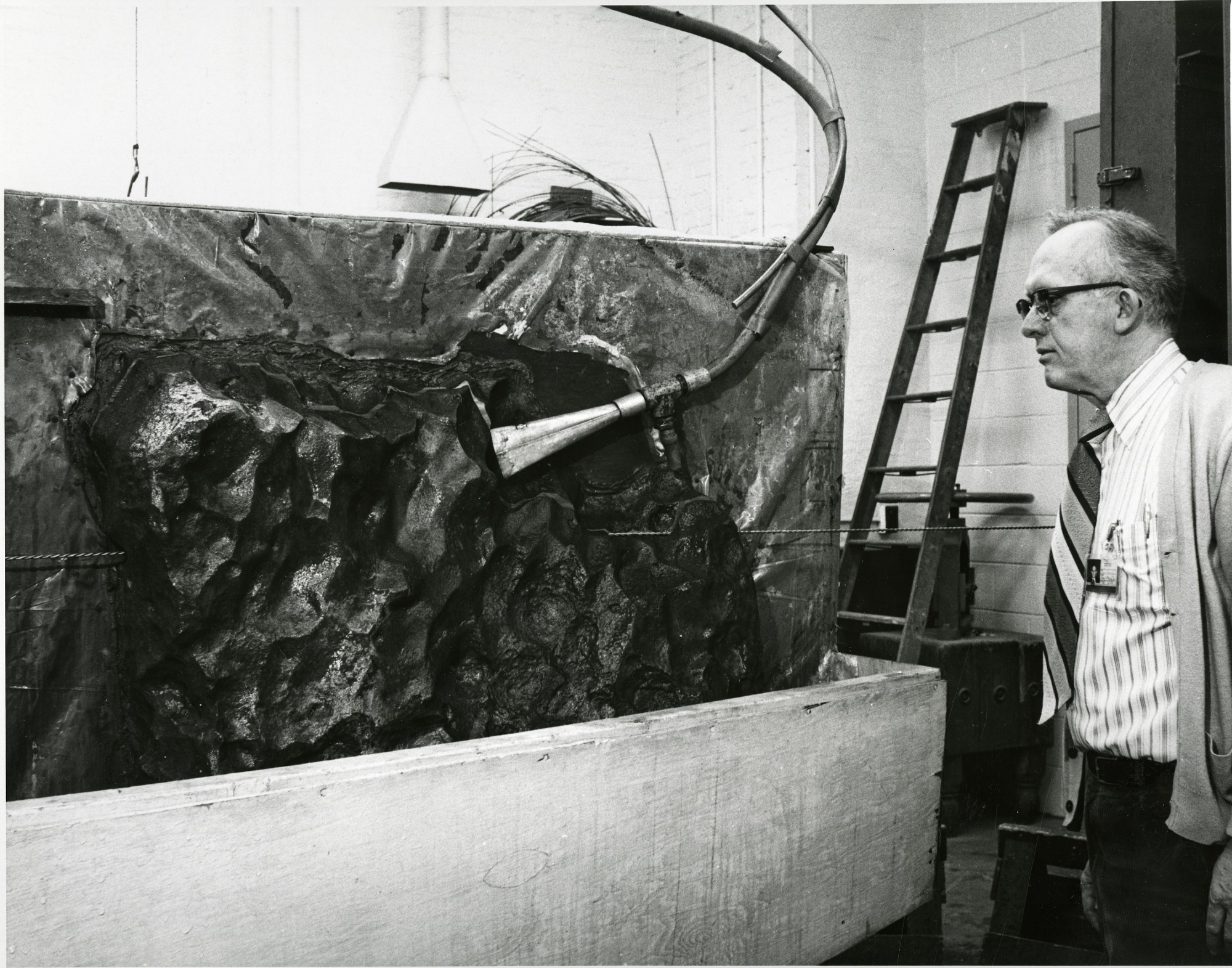 Dr. Roy S. Clarke, Jr., curator of the Smithsonian's National Museum of Natural History meteorite collection, monitors the cutting the Old Woman Meteorite discovered in the Old Woman Mountains in the Needles Resource Area, San Bernardino County, California, a job that takes several months to complete. The bulk of the meteorite has a screen placed around it to protect it from the water and abrasive slurry used in the cutting process.