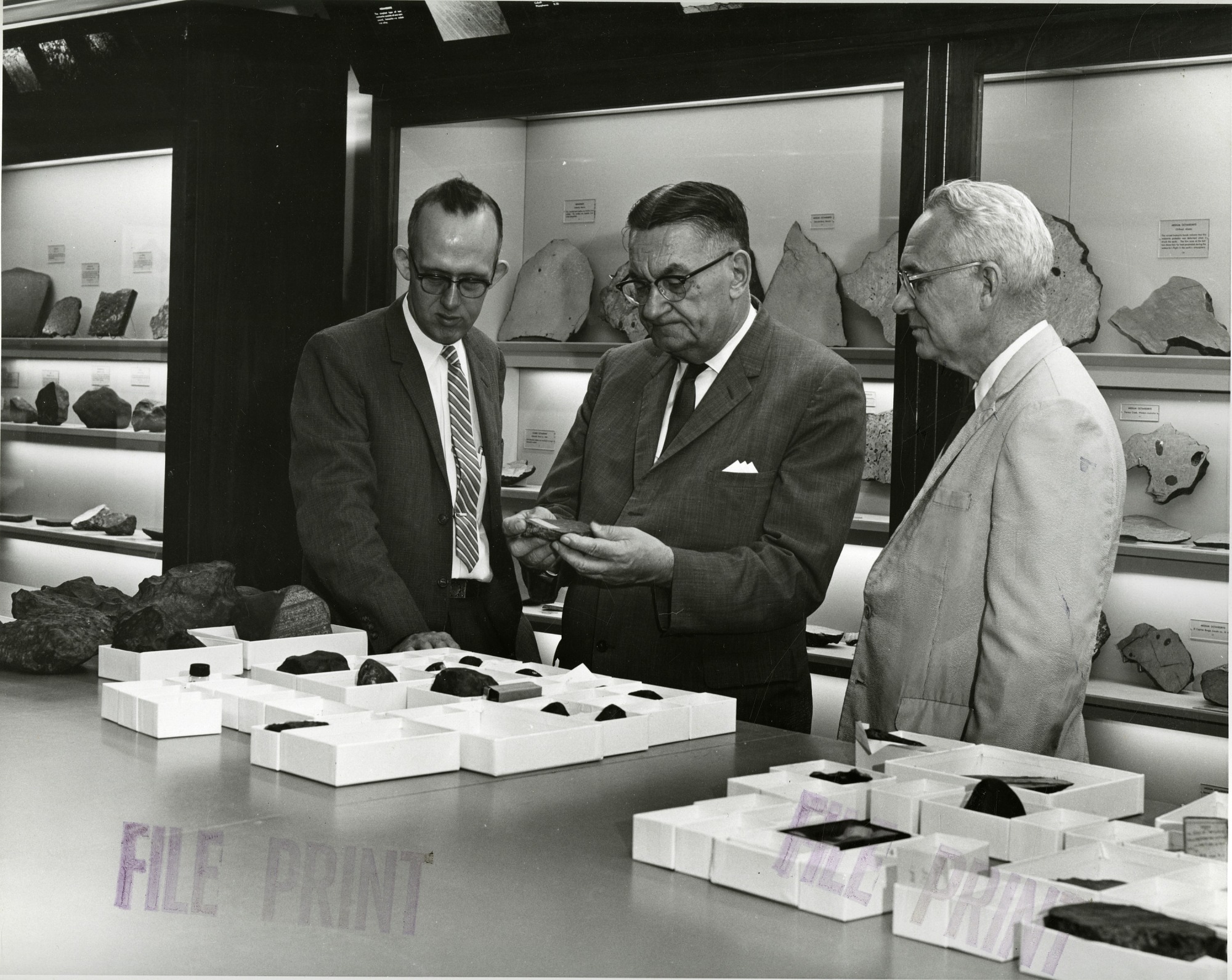Roy S. Clarke, Jr. (left) and Edward P. Henderson (right) study the Allen Collection of meteorties soon after its acquisition by the National Museum of Natural History in 1964, together with Representative John Edgar Chenoweth (Republican) of Colorado (center).
