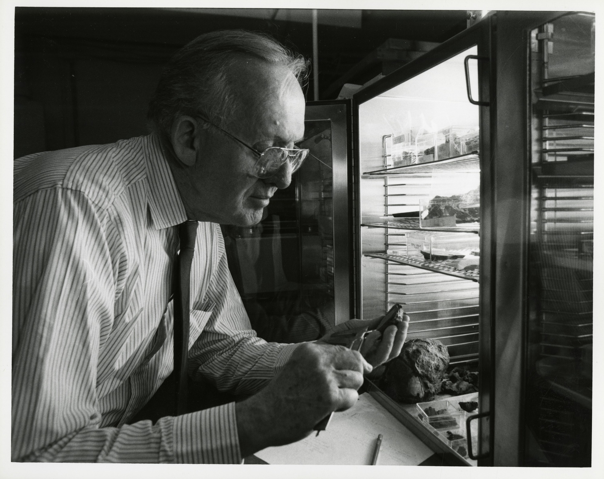 Roy Clarke, curator, Department of Mineral Sciences, National Museum of Natural History, in the storage room looking at a iron meteorite with the aide of a magnifying glass. Additional specimens can be seen in the storage unit. As indicated by Roy Clarke, the image was taken for a publicity shot.