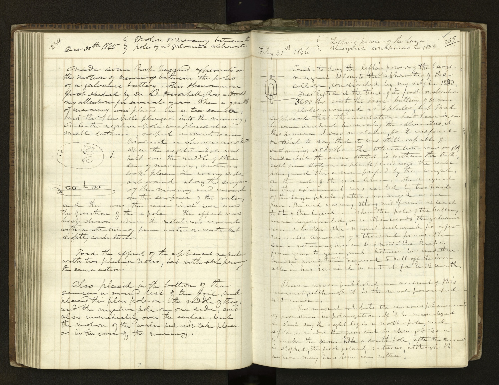 A record of an experiment demonstrated to his class by Joseph Henry, then a professor at Princeton University and later first Secretary of the Smithsonian Institution, February 21, 1846. In the experiment, Henry demonstrated one of his large magnets that was constructed in 1833. The magnet was able to hold 3500 pounds and Henry notes that he it is the most powerful magnet ever made at the time.