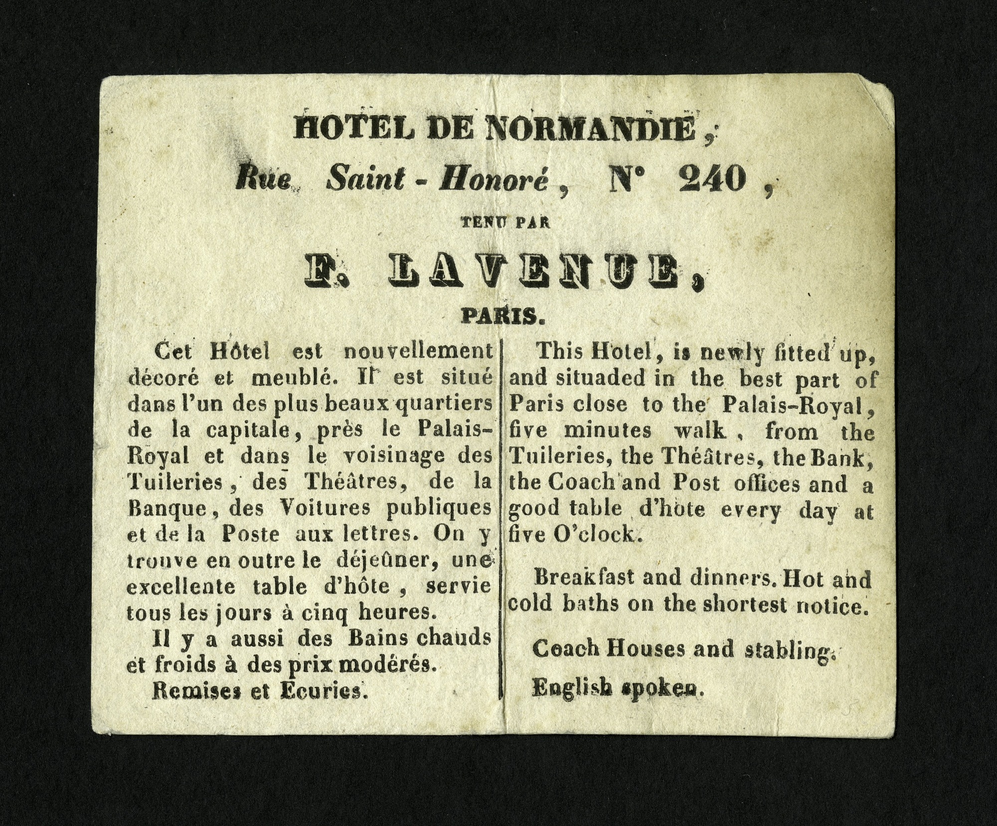 A Hotel de Normandie newspaper advertisement, a souvenir from Joseph Henry's 1837 tour of Europe.
