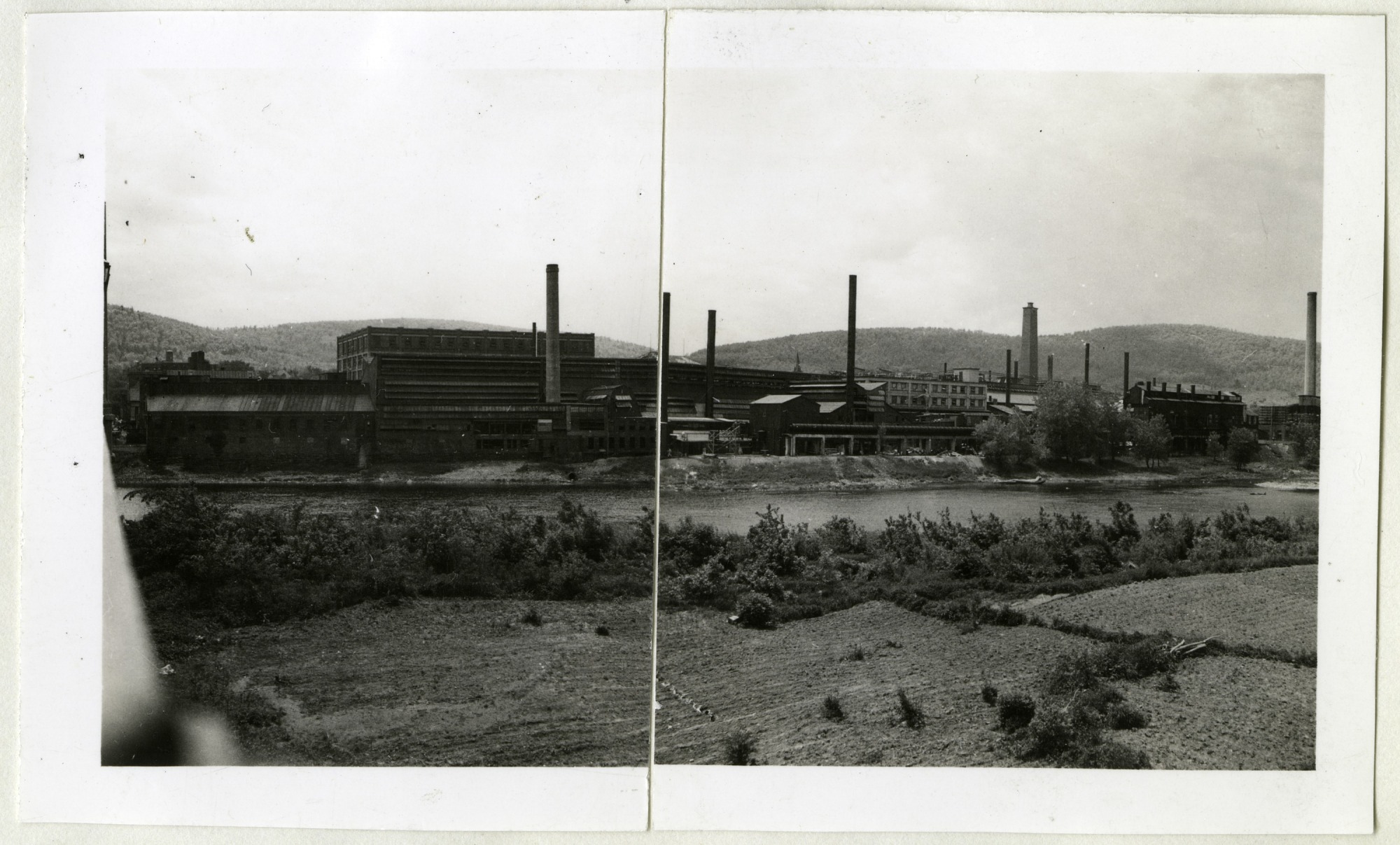 Buildings of Corning Glass Works, a manufacturer of glass and ceramic products for industrial, scientific and technical uses, viewed from a distance. The Chemung River is in the foreground as it flows by the manufacturing plant.