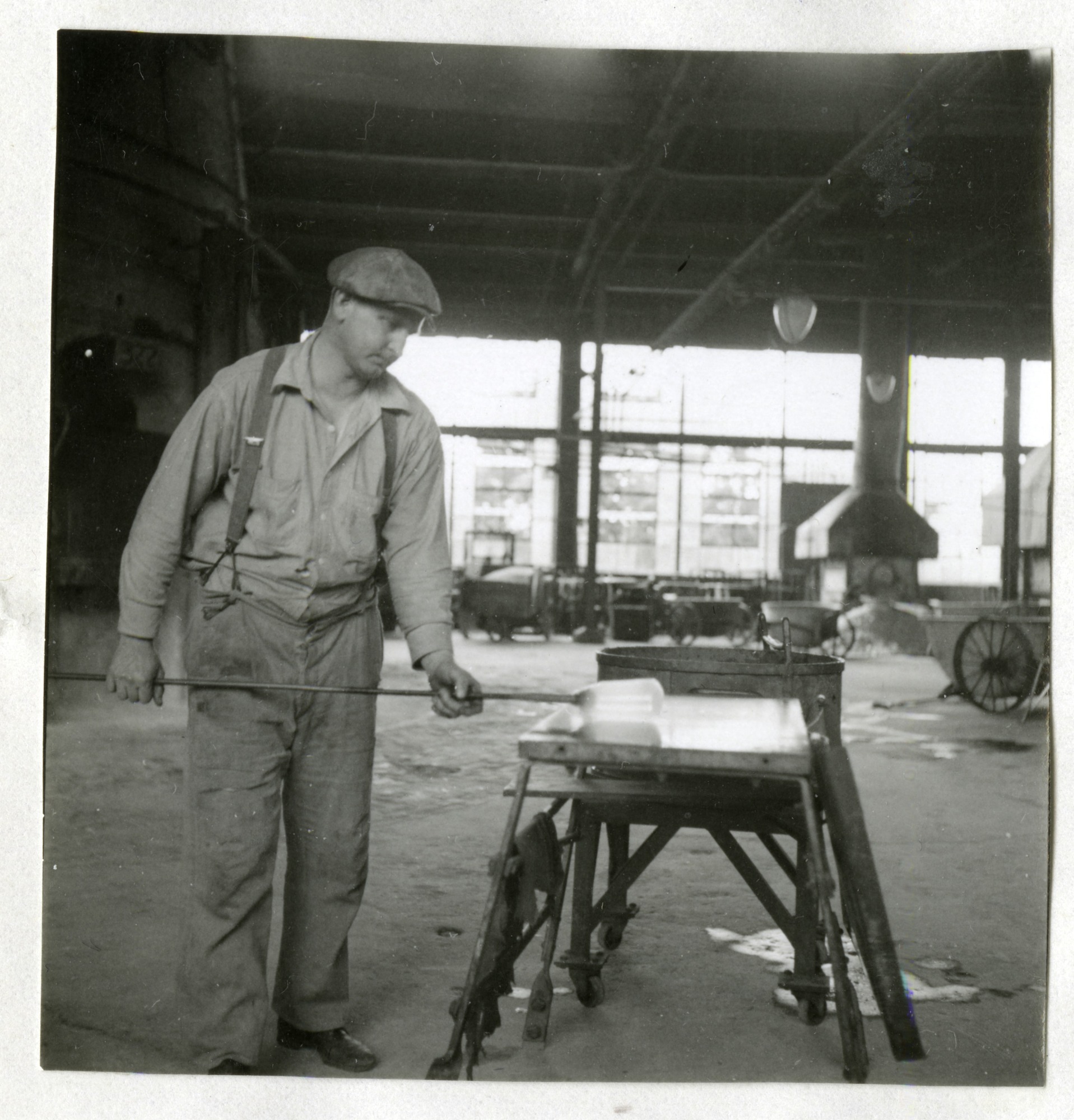 A worker at the Corning Glass Company, a manufacturer of glass and ceramic products for industrial, scientific and technical uses, at Corning, New York, shown in the process of making a glass object.