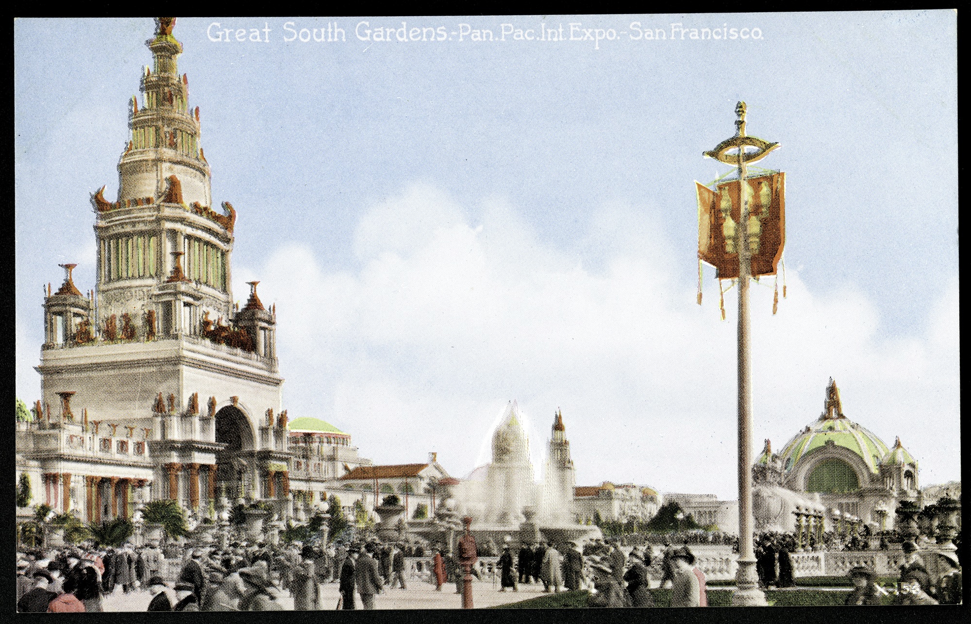 Postcard from the Panama-Pacific Exposition in San Francisco, California. The postcard shows the Great South Gardens. The exposition was intended to illustrate the function and administrative faculty of the Government of the United States and to demonstrate the nature and growth of its institutions, their adaptation to the wants of the people, and the progress of the nation in the arts of peace and war. The Smithsonian Institution contributed an exhibit focusing mainly on ethnology.